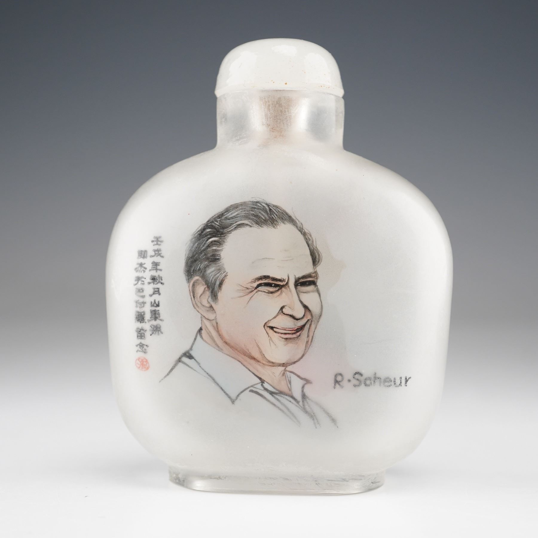 Reverse painted glass snuff bottle featuring a detailed depiction of a cat among peony blossoms and a rock garden on one side, symbolizing prosperity and playfulness. The reverse side presents a finely executed portrait of a smiling man inscribed R. Scheur alongside Chinese calligraphy and a red seal mark. The bottle is crafted from semi-translucent glass with a frosted finish and fitted with a matching domed glass stopper and interior spoon. A distinctive example of the personalized reverse-painted snuff bottles produced in the late 20th century, combining traditional technique with modern portraiture.