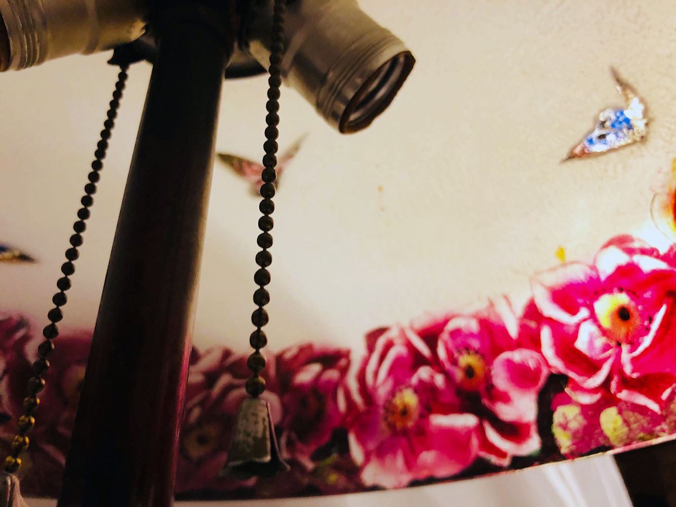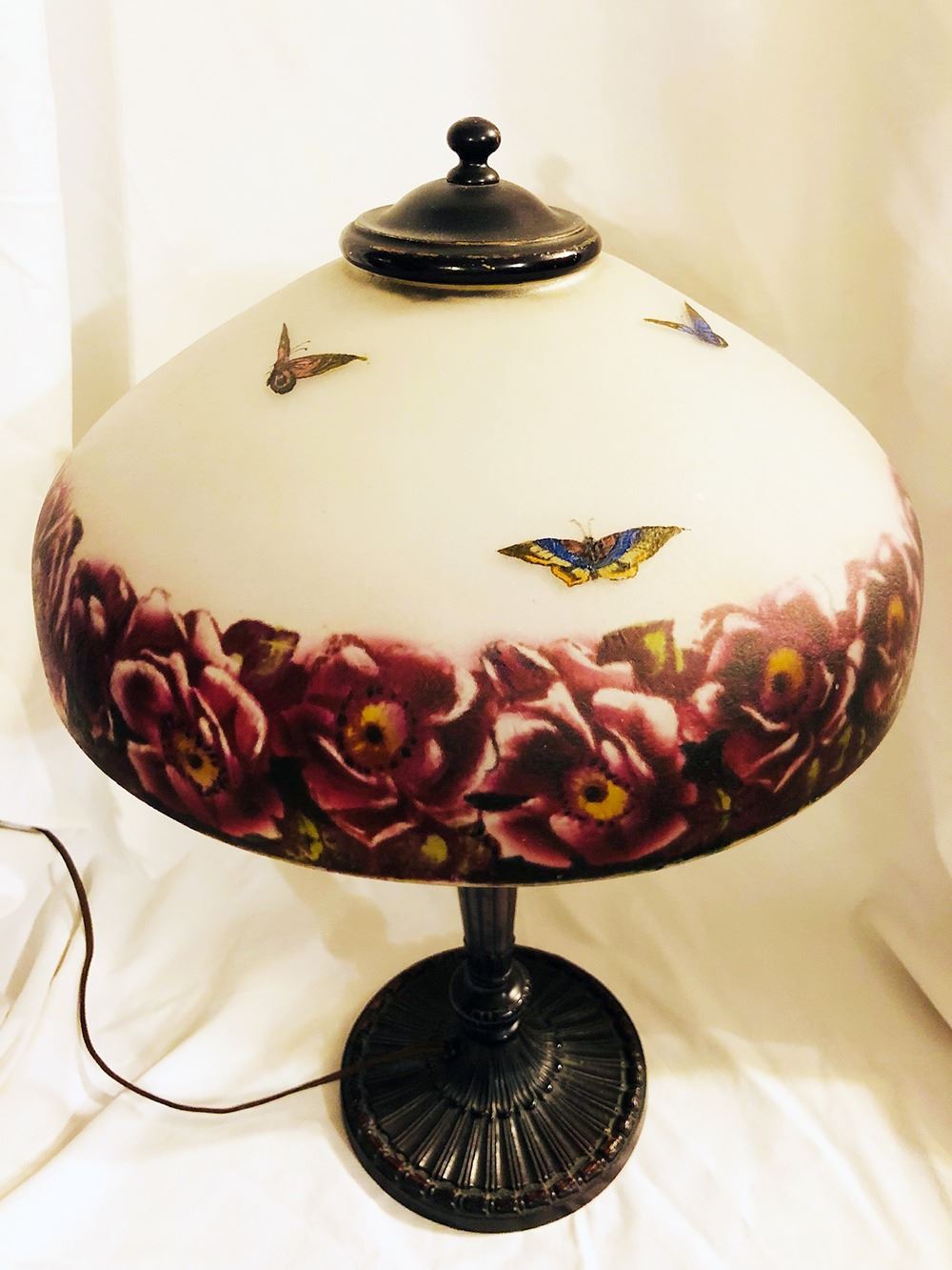 Reverse painted lamp with butterflies and flowers, has small heat crack.Rare background, uncommon and unusual scene with butterflies.