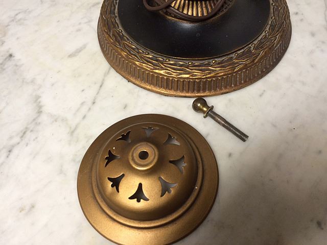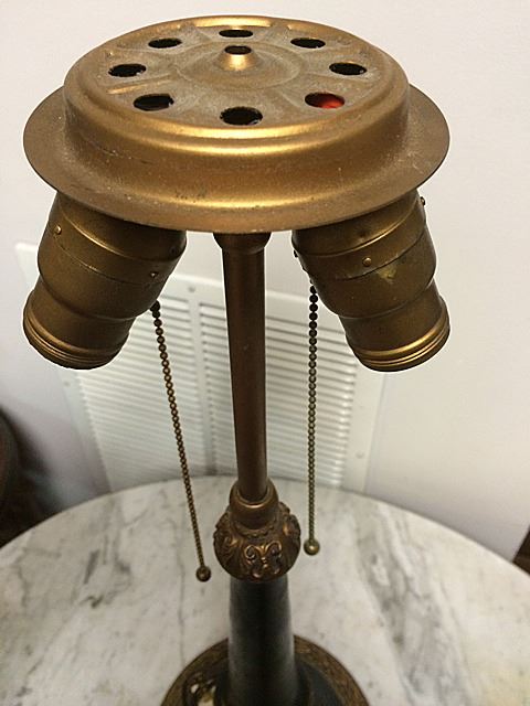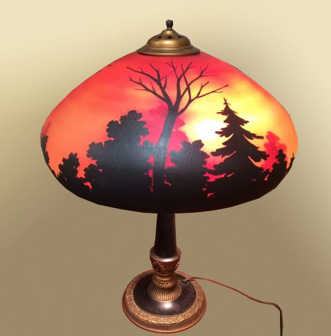 Beautiful reverse painted table lamp that fall evening in silhouette. Beautiful, bright orange, reds and yellows when lit, against dark landscape. Double bult, chain pulls, with very nice black and brass lamp base.