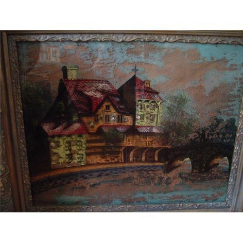 Beautiful LUXEMBOURG,PARIS; A stone arched bridge leading to a brightly painted what I believe to be an old Inn; A canal or river flows in front of Inn and under bridge; A dark figure stands alone on the bridge (very mysterious). What a wonderful use of bright green's, reds, orange, and blue. Genuine Mother of Pearl has been ornately used throughout the Inn adding the illusion of light coming from within; Original very old frame with newer highly decorative molding frame attached; GORGEOUS.