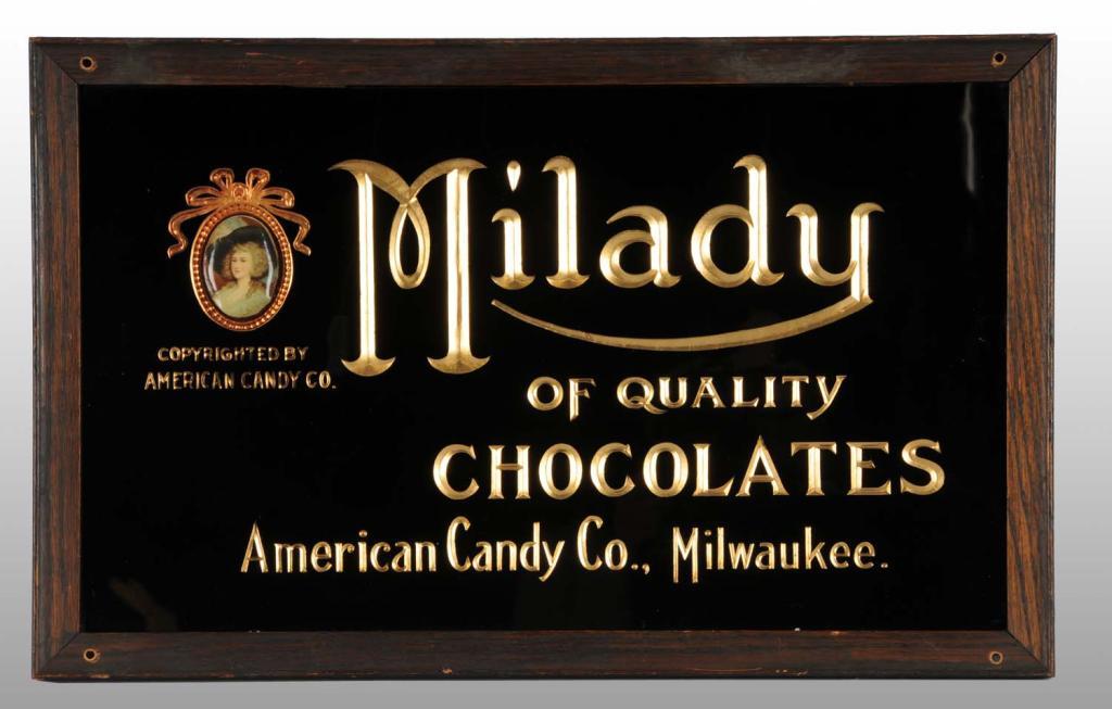 Description Milwaukee, WI. Circa 1910. Original frame with four holes drilled for mounting. Celluloid inset is slightly curled at edge, otherwise a gorgeous sign with just minor marks. Condition (9.0, Near Mint). Size 13" x 22".