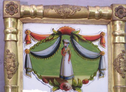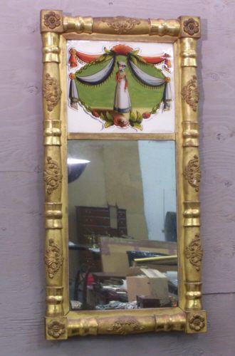 Reverse painted gold leaf wall mirror. This looking glass retains its original gold leaf and reverse painting of a woman.Measures 33 and one quarter inches long 17 inches wide.