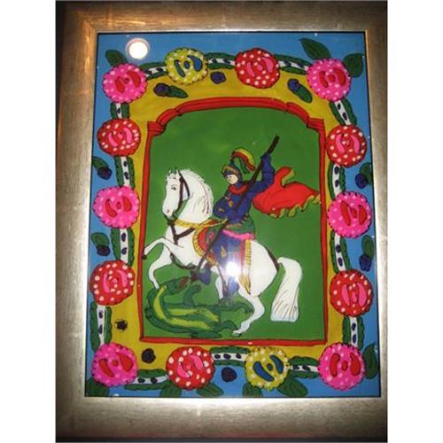 Lovely reverse on glass of George fighting the Dragon in a newly made frame . Colors are vibrant in this folkloric piece.