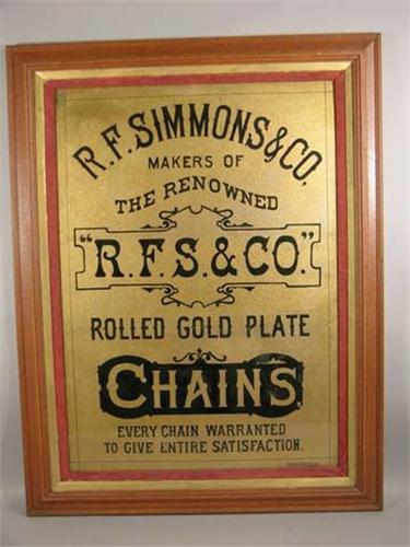 Reversed glass sign for R.F. Simmons Co. makers of rolled gold plate chains, 34" x 44" including frame. Very good cond.