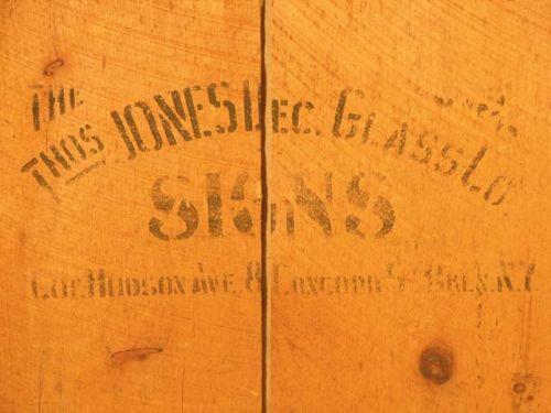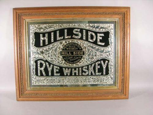 Reversed on glass sign for Hillside Rye whiskey, PA. Sign Co. logo on back, Thomas Jones Glass Co., NY. 31" x 25" including frame. Ex. cond.
