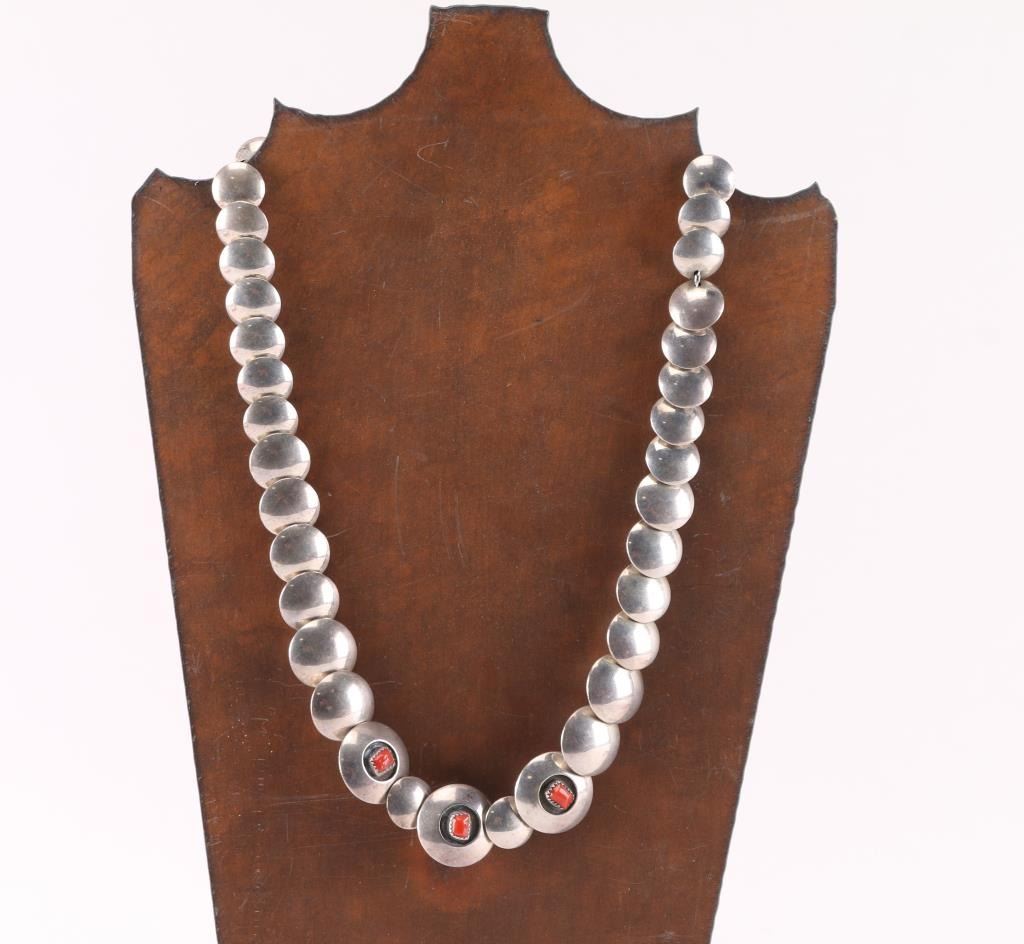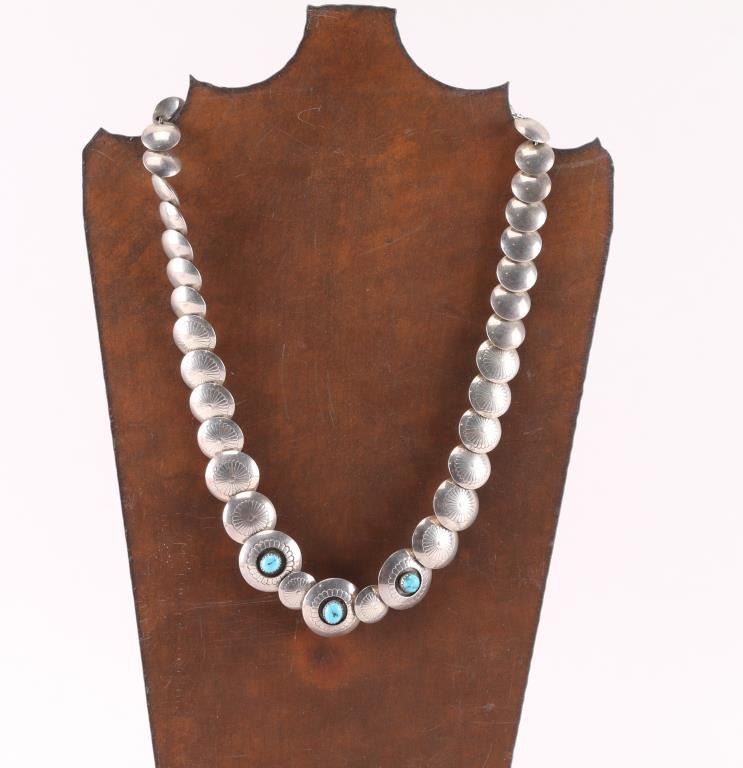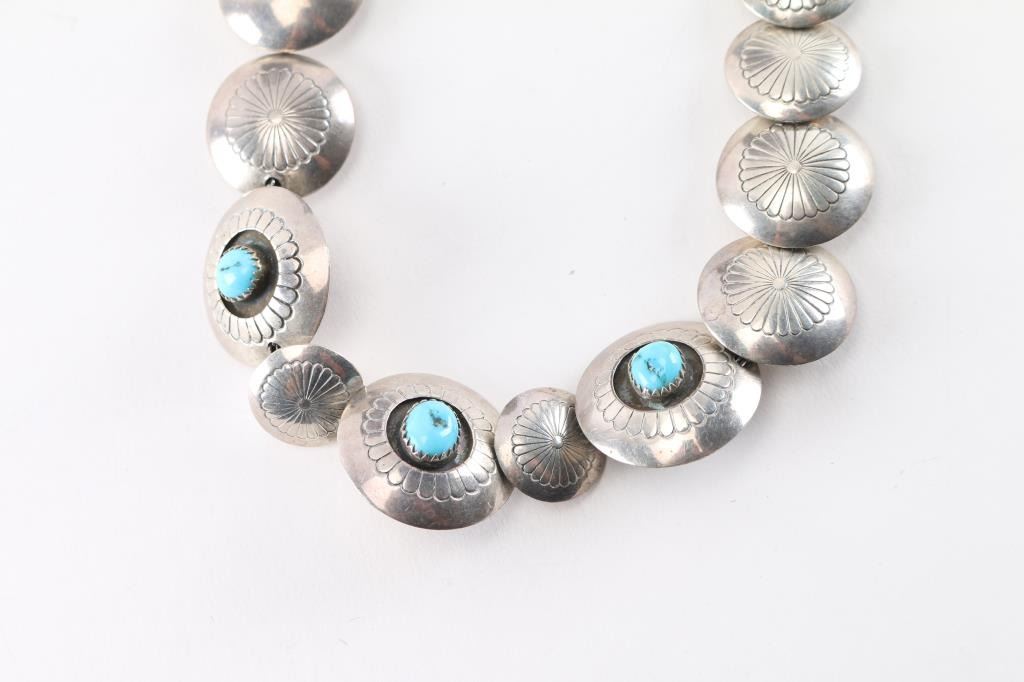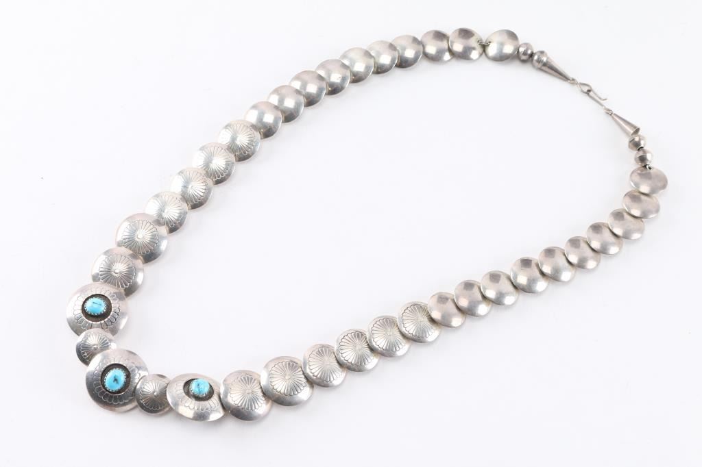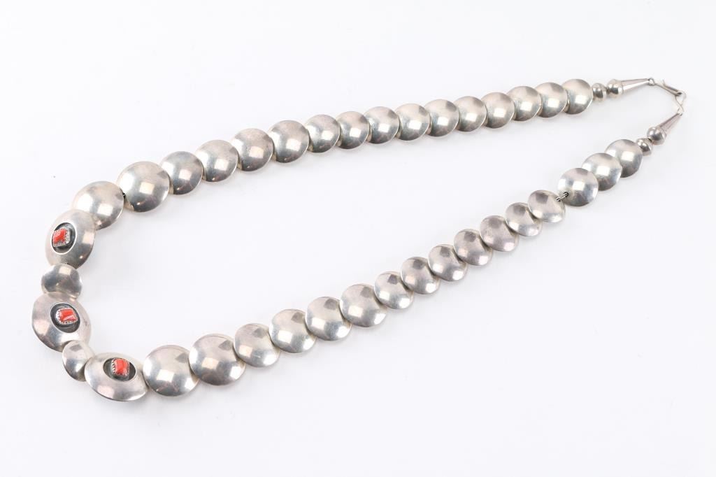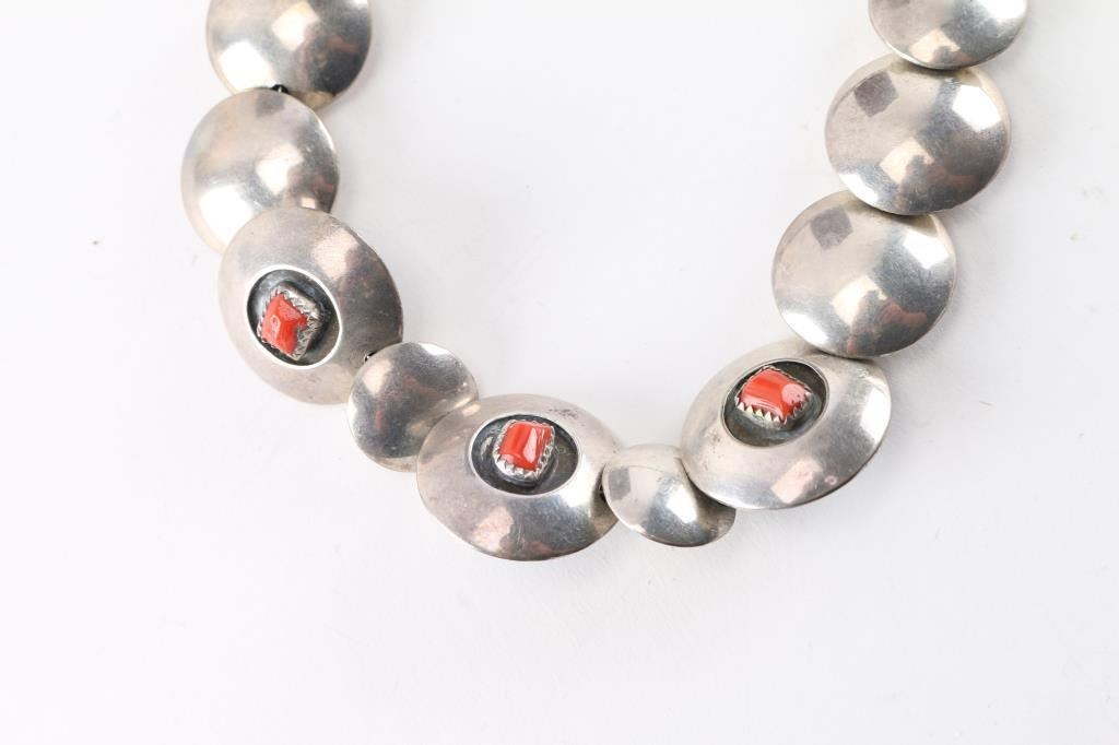 Sterling silver discs with etched design and 3 round turquoise stones on one side, and smooth silver with 3 square coral stones on the other side. Measures 11" from drop.