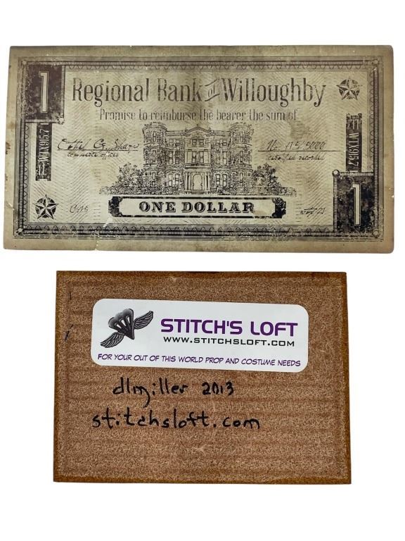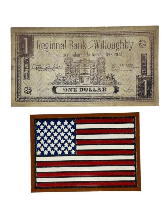 Original prop leather flag patch and banknote used in the post-apocalyptic science fiction television series 'Revolution' (2012-2014), where Fifteen years after a permanent global blackout, a group of revolutionaries seeks to drive out an occupying force posing as the United States Government.