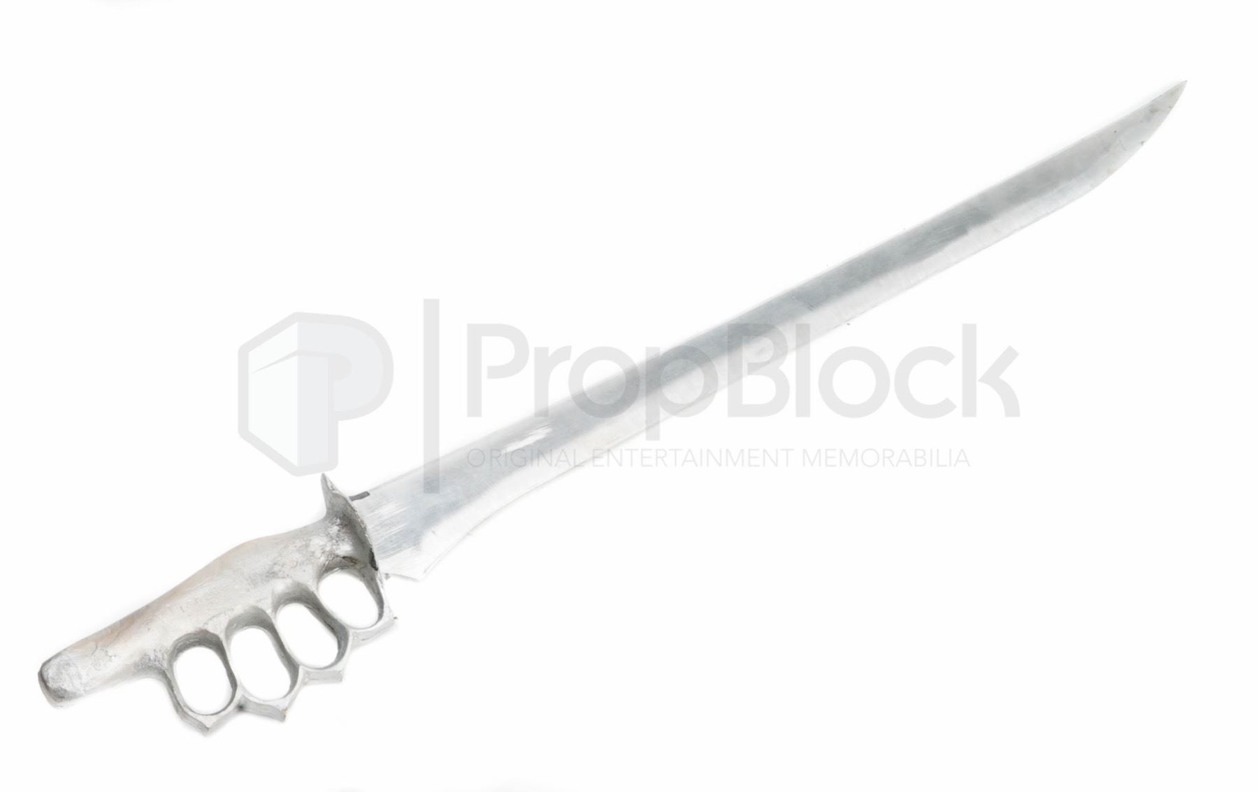 Monroe militia sword featured in the science fiction television series Revolution. After an unknown event, people have to adjust to life without electricity. This sword can be seen in various episodes as it was one of the main weapons for the Monroe Militia. The handle is made of cast resin and silver in color with e "M" logo engraved in one side. The blade is made of aluminum and has been sharped by the production. This item remains in excellent, production used condition.