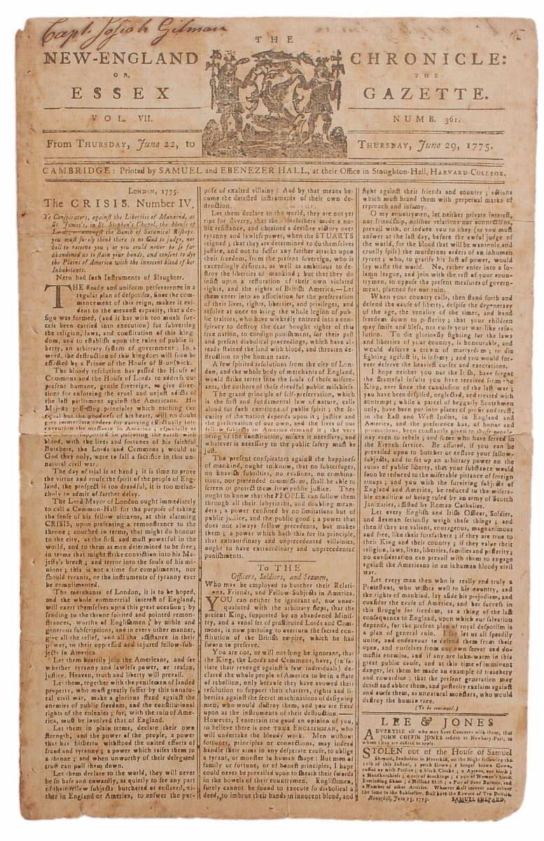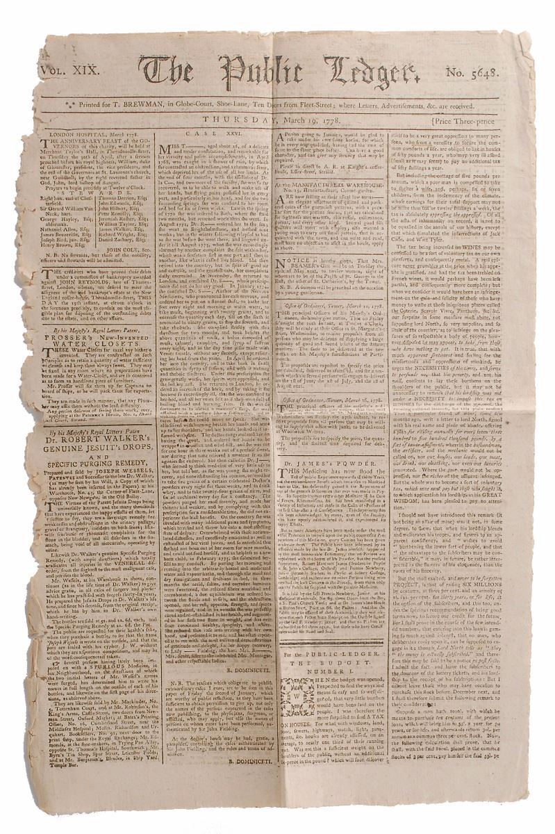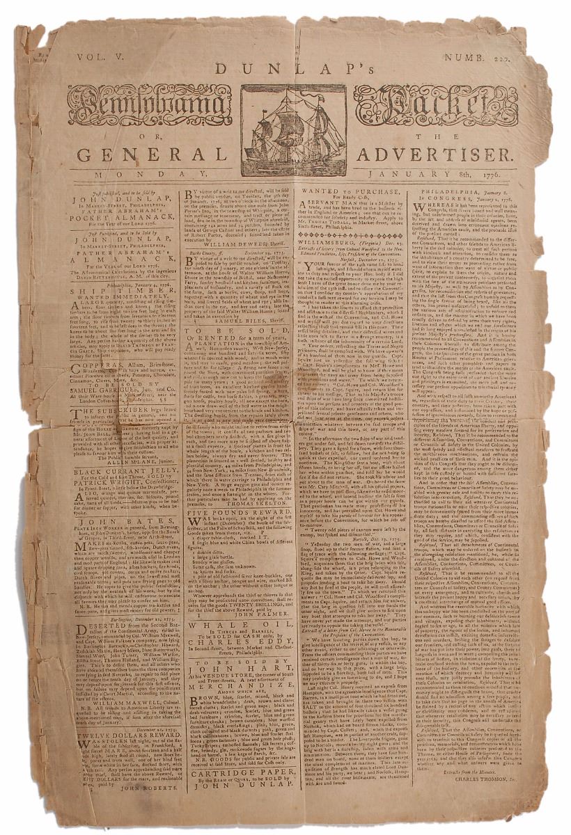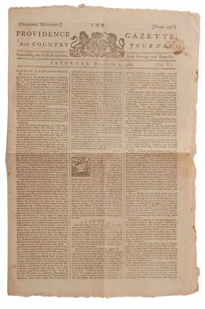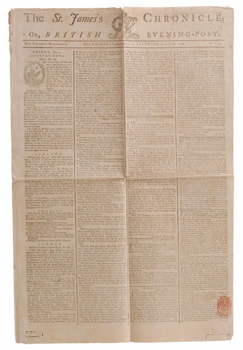 Five newspapers dating from the colonial period into the American Revolution, including: The Providence Gazette, Rhode Island, December 3, 1768; The St. James’s Chronicle, London, January 6, 1770; The New England Chronicle, Cambridge, June 29, 1775; Dunlap’s Pennsylvania Packet, January 8, 1776; and The Public Ledger, London, March 19, 1778. In overall very good condition, with overall brittleness and some significant chipping to edges.