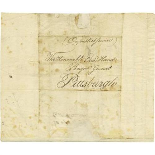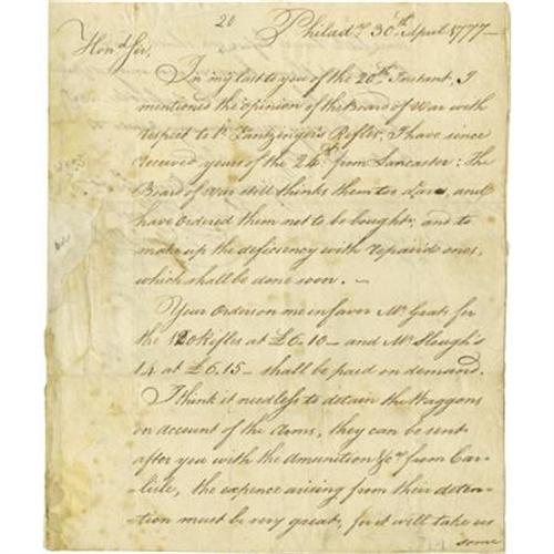 <B>Revolutionary War Arms Content Autograph Letter Signed,</B></I> "<I>Benj. Flower</B></I>", two pages with address panel, 7.75" x 9.25", Philadelphia, Pennsylvania, April 30, 1777, to Brigadier General Edward Hand, Pittsburgh, Pennsylvania. It reads, "<I>In my last to you of the 20th Instant, I mentioned the opinion of the Board of War with respect to P. Zantzinger's Rifles; I have since received yours of the 24th from Lancaster. The Board still thinks them too dear, and have ordered them not to be bought; and to make up the deficiency with repair'd ones, which shall be done soon. Your orders on me in favor Mr. Grats for the 120 Rifles at £6.10 - and Mr. Slough's 14 at £6.15 - shall be paid on demand. I think it needless to detain the Waggons on account of the arms, they can be sent after you with the ammunition &c from Carlisle, the expence arising from their detention must be very great, for it will take us some little time before we shall be able to dispatch them, however you may depend on having them as soon as possible, as I shall use every means in my power to hasten them to you.</B></I>" A few stains and smoothed folds as expected. Old archival tape repair over a small area of marginal loss resulting from seal breakage. Fine condition.<BR>Colonel Benjamin Flower served the fledgling United States as a Commissioner of Military Stores and also as an officer in the Artillery Artifices Regiment. This splendid letter reflects the difficulties Americans faced when having to procure and transport arms. The "<I>P. Zantzinger</B></I>" referred to was likely Paul Zantzinger, a prosperous slave-holding merchant of Lancaster, Pennsylvania. <I>Ex. Henry E. Luhrs Collection.</B></I><BR><BR><BR><b>Shipping:</b> Flat Material, Small (<a target="_blank" href="http://www.heritageauctions.com/common/shipping.php">view shipping information</a>)