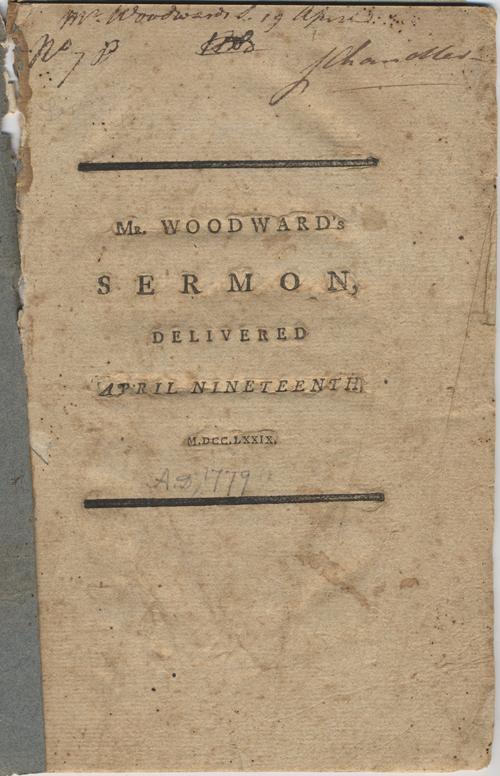 Colonist John Chandler, one of the eighty Lexington men who faced the British that morning of 19 April 1775, signs a printed sermon delivered four years later to commemorate the Battle of Lexington. Pamphlet, ''A Sermon Preached at Lexington, April 19, 1779,'' signed ''J Chandler'' at upper right of half title page. Printed by John Gill: Boston: 1779. The title page records that Samuel Woodward, Pastor of the Church in Weston, delivered the sermon ''In Commemoration of the great Distress and wonderful Deliverance of God's People on the Nineteenth of April, 1775; where Hostilities begun, and when the bloody War between Great-Britain and her Colonies commenced.'' Rev. Woodward's sermon reads in part, ''To sympathize with the friends of those who fell the first victims to British tyranny in this place…it is owing to the help of the Lord, - to his sparing distinguishing mercy, that you escaped, that day when your neighbors and fellow-soldiers slept in death!…a desire to avenge the blood of your slaughtered brethren and defend your country, has led you to cultivate the art of war, and inspired you with the spirit and resolution of soldiers, - a character which the present times have taught us, is most respectable indeed…'' An oblong portion measuring 4'' x .75'' has been cut from the title page beneath Woodward's name, above the printing information. The original gray covers are present, but detached, and the pages show various degrees of foxing. The upper right corner of page 21 has been torn off, affecting six lines on page 21 and seven lines on page 22. Penned in unknown hand across top: ''Mr. Woodwards 19 April / No 7 P.'' and penciled: ''A.D. 1779.'' Overall in fair condition. 29pp. measuring 5.5'' x 8.75''.