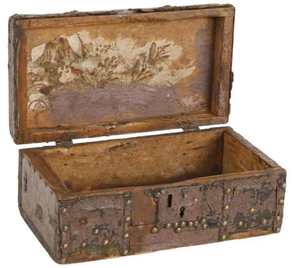 Revolutionary War Document Chest. This is a wooden box with a leather and canvas wrap with brass tacks. The box measures 12" long by 6 1/4" wide by 5 1/4" high. It has a lockplate on the bottom half but is missing the clasp on the top lid. Inside the box is a small container with some old lead shot and some wadding.