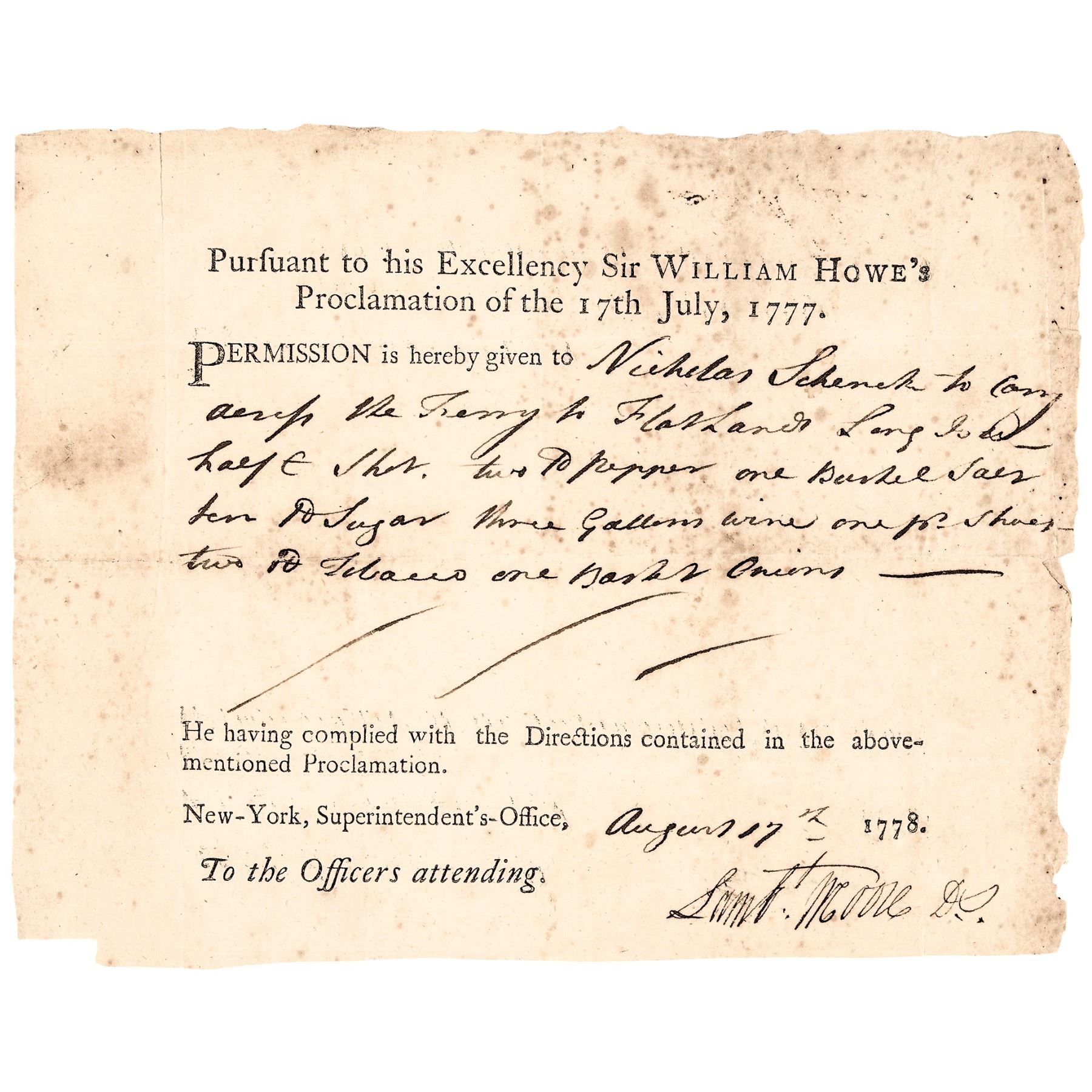 “Pursuant to his Excellency Sir William Howe’s Proclamation of the 17th July, 1777. --- Permission is hereby given to - Nicholas Schenck to carry across the ferry to Flatland Long Island hay and shers, two lb. pepper, one bushel salt, ten lb. sugar, three gallons wine, one pr. shoes, two lb. tobacco, one basket onions. ----