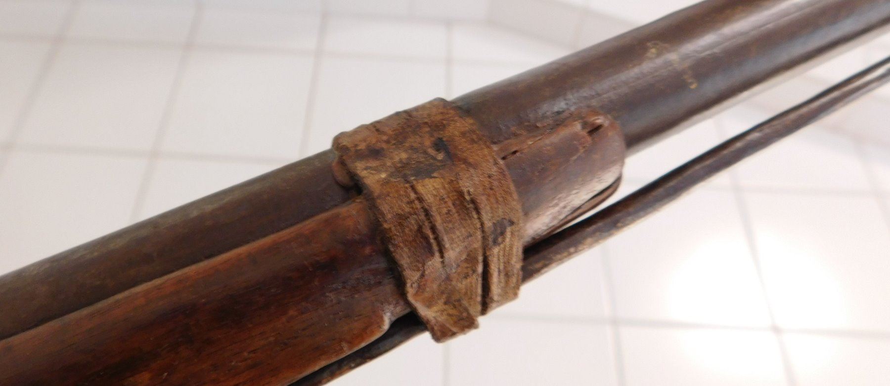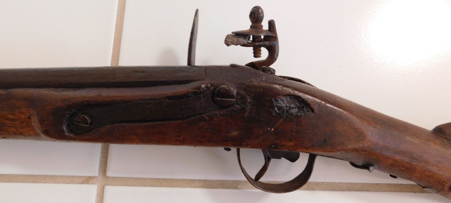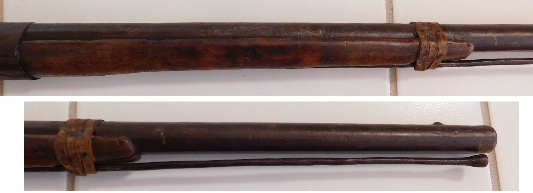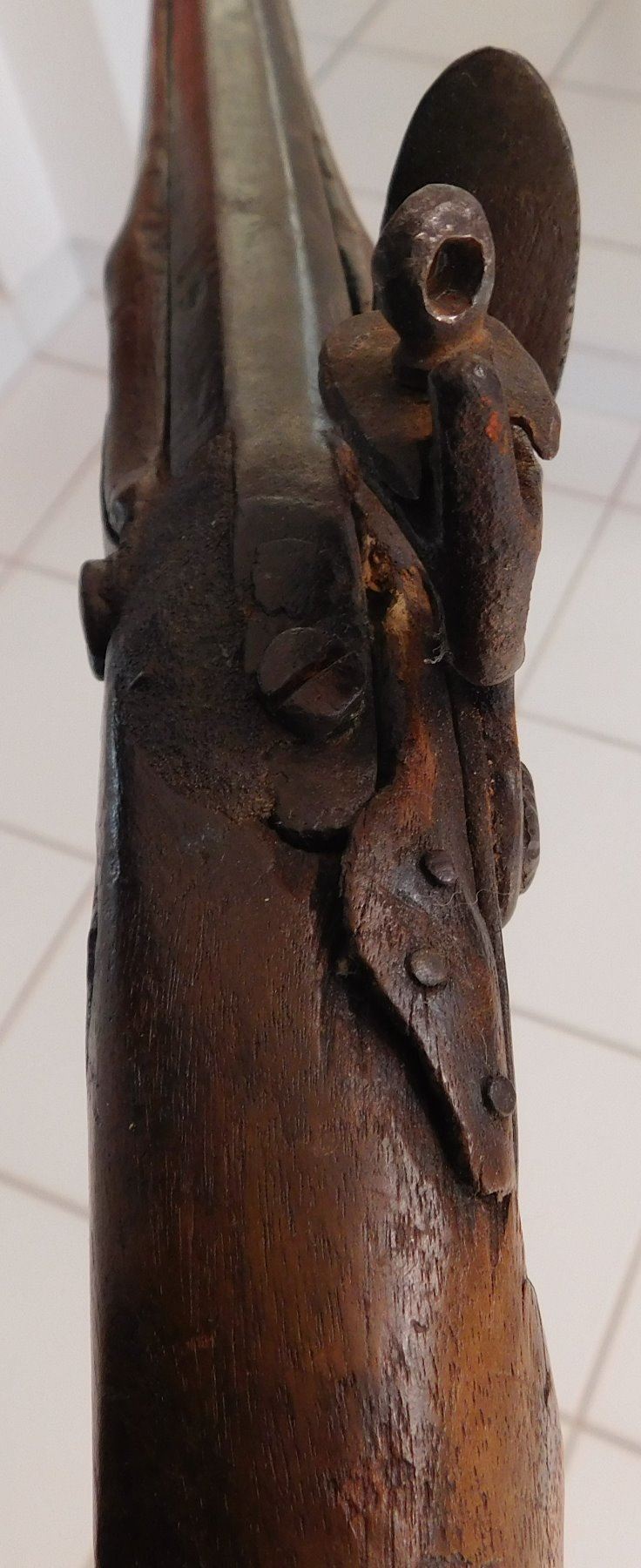 Revolutionary War Flint Lock Rifle, circa 1770s-80s. Made of wood, steel, flint and leather, the item measures 51" long. American. Believed to have been traded to Native Americans due to the added leather repair. Condition: Well-worn, see images. Shipping: $60.00 USA estimate only, due to size and weight, w/insurance and signature.