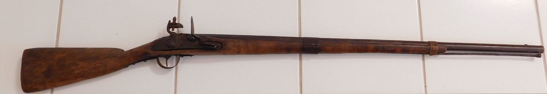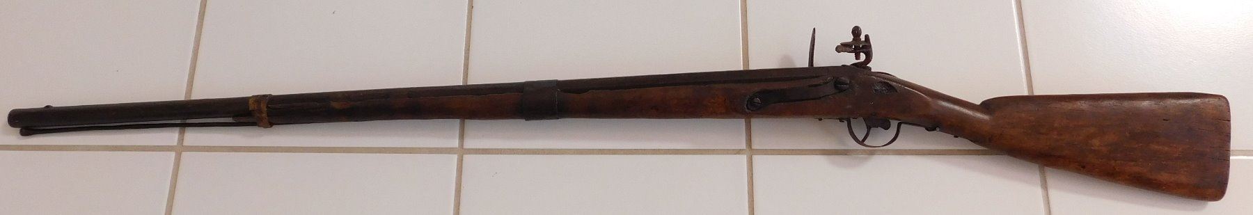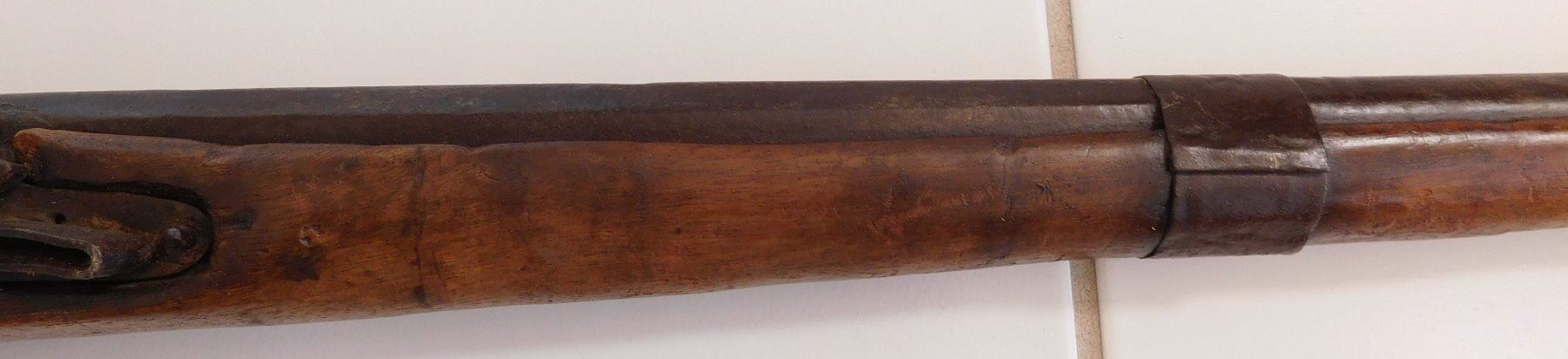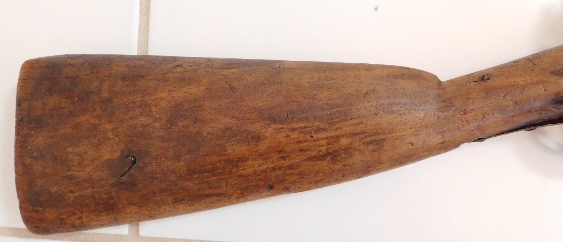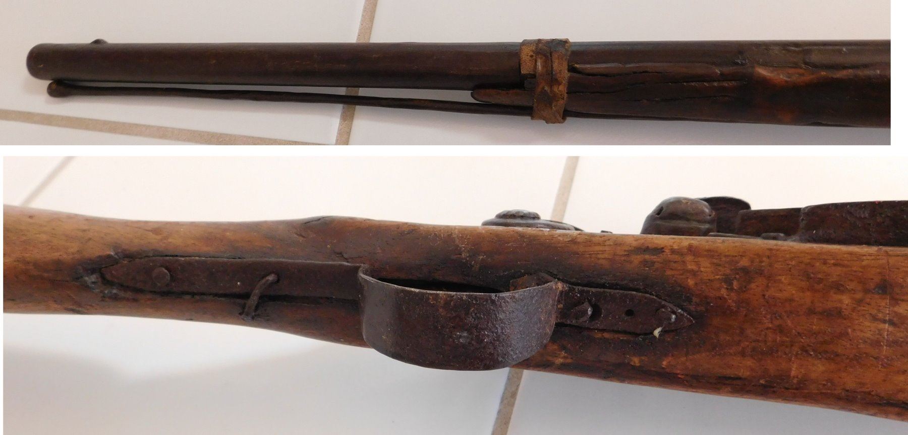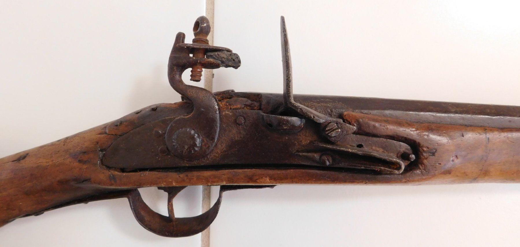 Revolutionary War Flint Lock Rifle, circa 1770s-80s. Made of wood, steel, flint and leather, the item measures 51" long. American. Believed to have been traded to Native Americans due to the added leather repair. Condition: Well-worn, see images. Shipping: $60.00 USA estimate only, due to size and weight, w/insurance and signature.