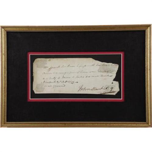 <B>Revolutionary War General John Stark Autograph Document Signed,</B></I> “<I>John Stark B G</B></I>”, 7.25” x 3.25”, Newport, Rhode Island, November 31, 1779. A military pass, the document reads, “<I>Mr. March has leave to pass with his boat to Providence & to carry a piece of linen some tea, Two cases & a half of knives & forks & a small trunk.</B></I>” Uneven right edge, old tape bleed-through in four corners from early mounting. professionally matted and framed. Good condition.<BR> New Hampshire native John Stark (1728 - 1822) is credited with uttering what would one day be used for his state's motto - “Live Free or Die”.<BR><BR><b>Shipping:</b> Framed - with Glass, Small (<a target="_blank" href="http://www.heritageauctions.com/common/shipping.php">view shipping information</a>)