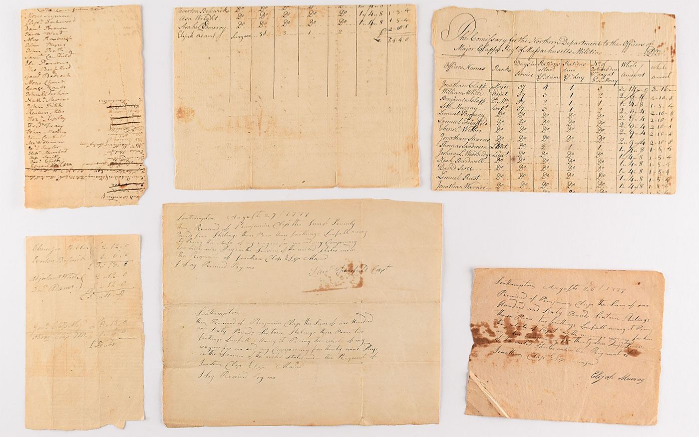 Five Revolutionary War-era DSs relating to Major Jonathan Clapp and the Second Regiment of Militia in the County of Hampshire, including: a roll of soldier names, dated on the reverse to "Bethel, 16 March 1779"; a two-sided pay order for "Milage out, Milage In, Rations, Ration off'r," with reverse listing payments for "Jon'a Clapp, Maj'r" and "Benj'n Clapp, QM"; a commissary list for "Northern Department to the Officers of Major Clapp Reg't of Massachusetts Militia," which lists Major Clapp, his son, Benjamin, and Adjutant William White and Captain Seth Murray as leading officers; a pay order sheet dated August 27, 1777, concerning payments made to Samuel Fairfield by Quarter Master Benjamin Clapp for "thirty nine days in the Services of the United States and in the Regiment of Jonathan Clapp"; and a pay order dated August 26, 1777, for a payment to Captain Murray of "one hundred and sixty pounds sixteen shillings three pence two farthings...for him and his Company for thirty-nine days in the service." In overall very good to fine condition, with some light staining, and commissary list cleanly separated along horizontal fold.