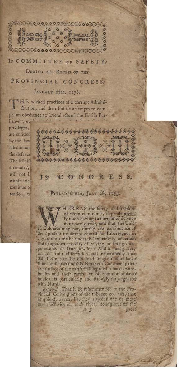 Scarce Revolutionary War pamphlet, printed on order of the Second Continental Congress, advising colonists on the manufacture of saltpeter, an critical ingredient of gunpowder. Dated 17 January 1776, with an introduction by Pierre Van Cortlandt of New York, who served in the Congress from November 1775 to May 1777, and as Chairman of the Committee of Safety. Reads in part, ''…The Ministry, flattering themselves, that so young a country, unused to manufacturers of every kind, will not be able to procure the means of defense within itself, have made, and will undoubtedly continue to make it a principal object of their attention, to preclude us from foreign supplies…'' 38pp. octavo volume disbound and uncut. Lacking title page, otherwise text complete. Leaf C6 (pages 35-36) included twice. Pamphlet included in following references of definitive American history texts: Sabin 22988; Evans 14930; Eberstadt 134:29. Light to moderate foxing and toning; heavy edge-wear and small closed tear (within text) to the second copy of leaf C6. Tiny stab holes to inner margins and occasional small holes. A very good copy of a rare primary source from the Revolutionary War. Pamphlet contained in a custom quarter leather portfolio case with gilt edged spine.