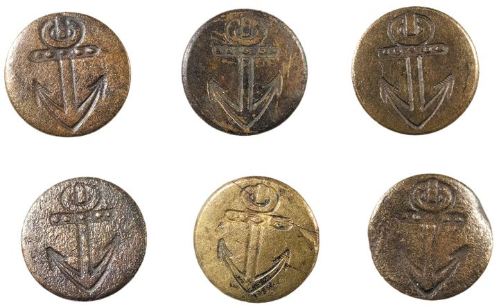 14 cm. This is an original lot of Six Revolutionary War Period British Merchant Navy Buttons, identified from a collection of early Royal Navy and Royal Marines. These Six brass buttons are all actually used, very pleasing, having identical, very clear anchor designs and size. All six have their original shanks attached, two being perfectly straight as made from the Royal Merchant Navy, dating to the American Revolutionary War. Sold “as shown.” A very scarce, lovely quality and very original matched set, rarely encountered as such. (Set of 6 buttons).