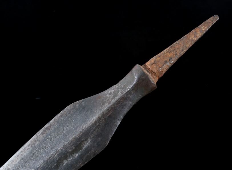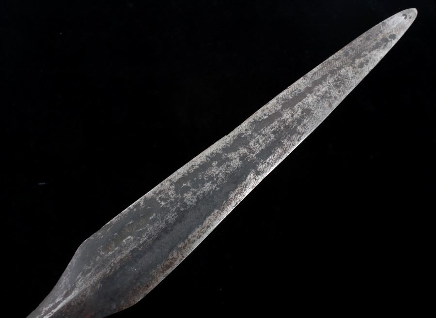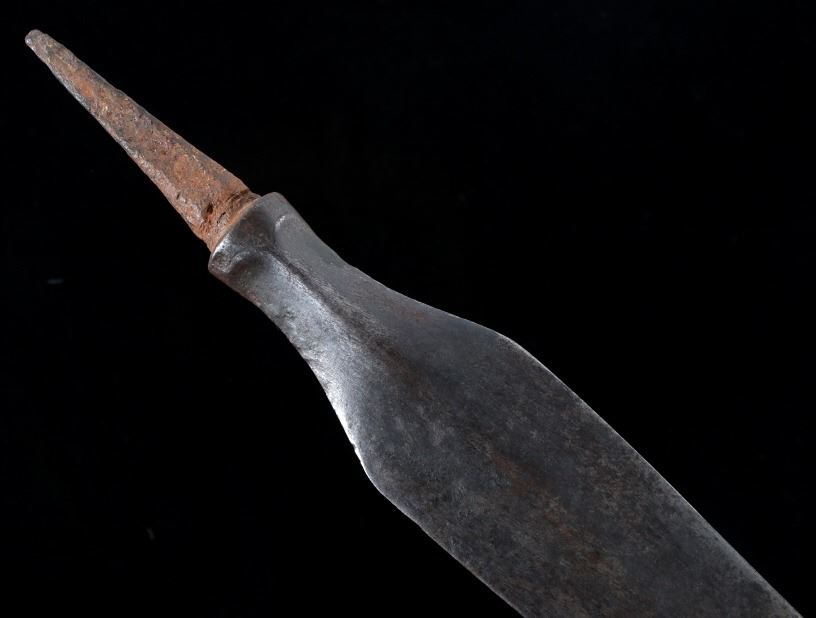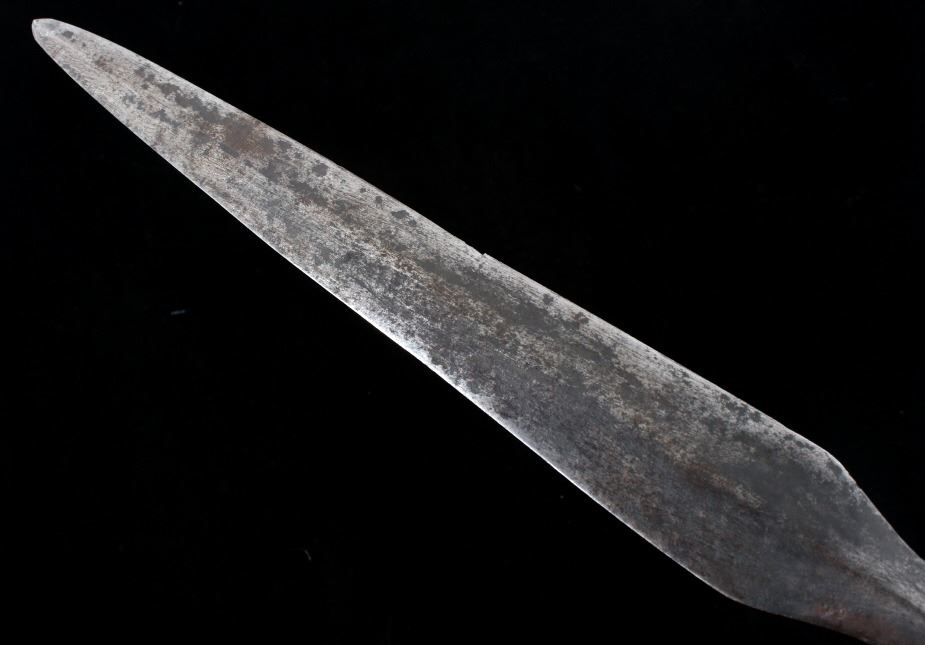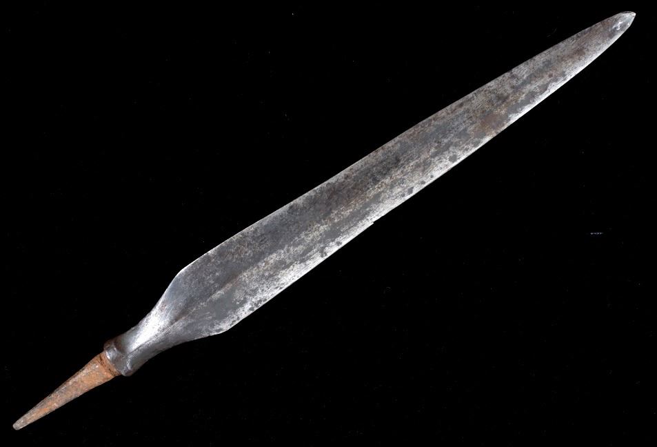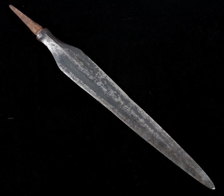 This is a spectacular example of an American Revolutionary War spontoon or plug bayonet dating to circa 1775-1776. The piece shows a forged iron large blade showing a superb medium ridge that was finely blacksmith forged down the entirety of the blade. The spontoon blade employs every trick of the iron forger of the utmost quality showing four-sided tapering mount which comes to the raised lip which has the four curves of the blade culminate. The piece overall shows fine condition for its over 240 year old age with some pitting. This example of American Revolutionary War blade has been well documented with other examples being seen in “SWORDS AND BLADES of the AMERICAN REV WAR by George Neumann #83 PA” and in “Collectors Illustrated Encyclopedia of the American Revolution" by Neumann and Kravic, pages 219 and 248. A spontoon blade can also be referred to as a half-spike, short spike, plug bayonet, partisan pole-arm, lance, halberd. Provenance: From a large American Indian collection in Billings. Overall the piece measures 17 7/8”L x 2”W x 1 1/8”D.