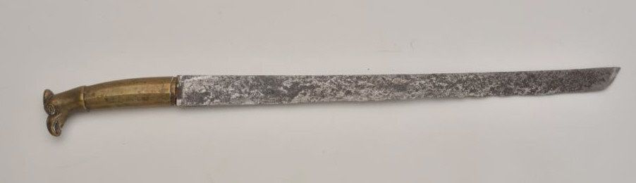 Revolutionary War era short sword with cast brass grip and 17” blade in near relic condition. Est.: $200-$300.