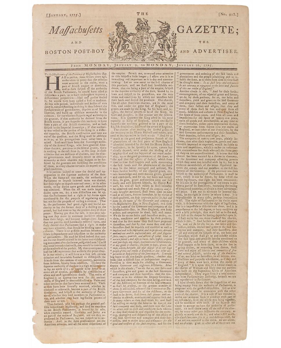 Original issue of the January 9–16, 1775 issue of the Massachusetts Gazette; and the Boston Post Boy and Advertiser, 9.5 x 14, four pages. The front page features loyalist Daniel Leonard's latest essay, part of his running battle of words with John Adams concerning the authority of Parliament over the American colonies. Signed in print, “Masschusettensis,” Leonard makes a lengthy and nuanced argument explaining why the colonies did not merit direct representation in Parliament yet were obligated to submit to its authority. He writes, in small part: “My dear countrymen, you have many of you, been most falsely and wickedly told, by our patriots, that Great-Britain was meditating a land-tax, and seeking to deprive us of our inheritance; but had all the malice and subtly of men and devils been united, a readier method to affect it could not have been devised, than the late denials the authority of Parliament, and forcible opposition to its acts: Yet, this has been done, planned and executed chiefly by persons of desperate fortunes.” In very good condition, with complete separation to spine, some scattered light creases and edge chips, and expected toning.
