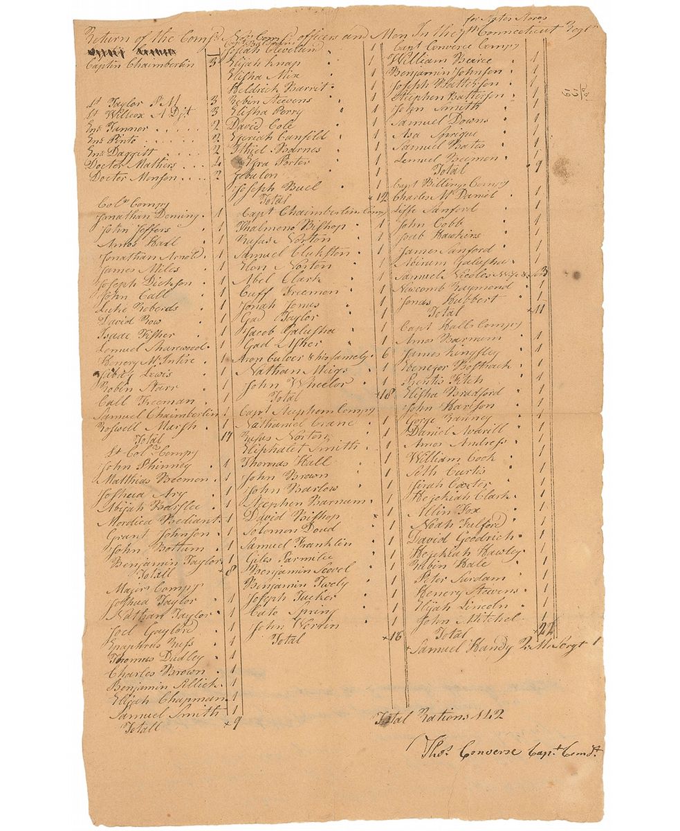 Revolutionary War–dated manuscript muster roll, signed “Thos. Converse Capt. Comdg.,” one page both sides, 8.25 x 13, December 18, 1780. A document for the 7th Connecticut Regiment, listing the names of the soldiers in each company and adding up totals of rum and wine rations. Confirmation of receiving this document is penned on the reverse by the quartermaster, signed “Samuel Handy, QM Sergt,” in part: “Rec’d on this Return…Wine and…Rum for Each Non Commissioned officer and private for which they are to pay the stated price.” In fine condition, with intersecting folds and expected document wear. Captain Thomas Converse was present at Valley Forge during the devastating winter of 1777–1778.