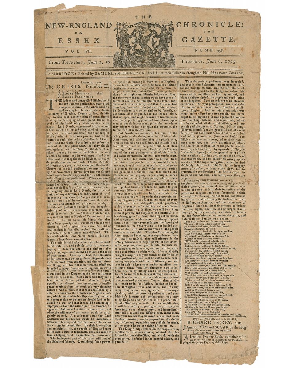 Revolutionary War–dated issue of the New England Chronicle and Essex Gazette, June 8, 1775, four pages, 9.75 x 15.5, printed by Samuel and Ebenezer Hall at their office in Stoughton Hall in Harvard College. The newspaper contains much war-related content, including an open letter to General Gage and a lengthy front-page editorial entitled “A Bloody Court, a Bloody Ministry, and a Bloody Parliament,” in part: “His Majesty, his minions, and instruments of slaughter, are now safe, in robbing the people of their property, by shameful and iniquitous taxes, in time of peace; safe in their subversion of the protestant religion; safe and successful in their cruel plan for starving the honest and industrious inhabitants, and destroying the trade of the town of Boston, in America, and the commerce of England; safe so far in their attempt to destroy the lives, rights, liberties, and privileges of millions; I say they are safe, in all these violations of, and depredations on our national security, and natural rights, because we are tame.” Tape-repaired separations to the adjoining fold, scattered creases, and several edge tears, otherwise very good condition.