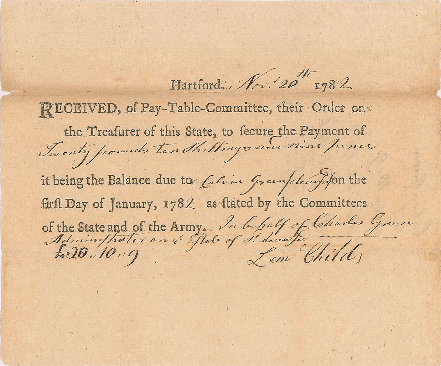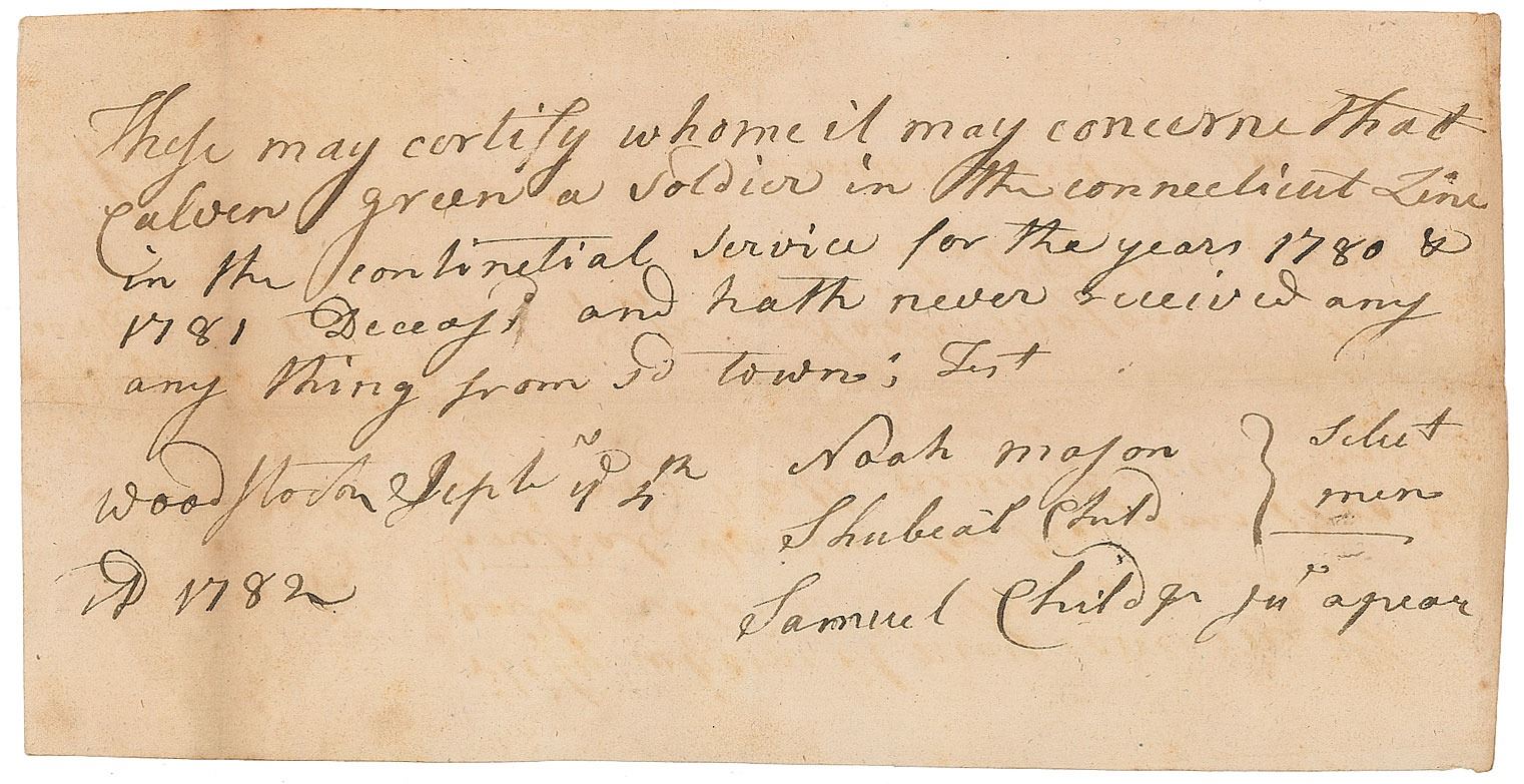 Four Revolutionary War–dated documents, each one page, related to Calvin Green, a soldier in the first troop of Col. Elisha Sheldon's famous Light Horse Dragoons, who was killed on April 4, 1782: a partly-printed pay order, November 20, 1782, for "Twenty pounds ten shillings and nine pence…due to Calvin Green/deceased…In behalf of Charles Green, Administrator on s'd Estate of s'd deceased"; a manuscript affidavit, September 3, 1782, certifying that "Charles Green…hath been duly appointed Administrator on the Estate of Calvin Green"; a manuscript affidavit, September 4, 1782, stating "that Calvin Green a soldier in the Connecticut Line in the Continental Service for the years 1780 & 1781 Deceas'd…hath never received any thing from s'd town"; and a manuscript pay order issued by the Connecticut Committee of Pay Table, November 15, 1782, in part: "Deliver the Bearer any Security or Money that may be due to Calvin green a soldier in serving or who did serve in the Regiment of Light Horse commanded by Col. Sheldon." In overall very good to fine condition.