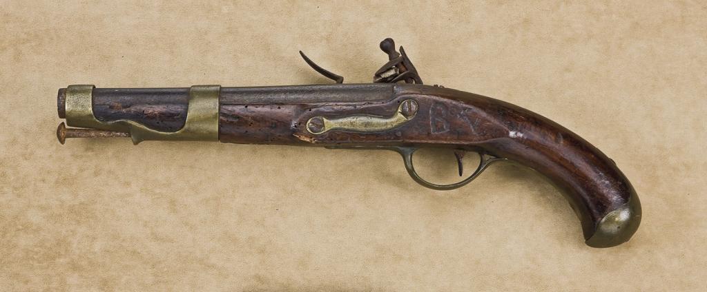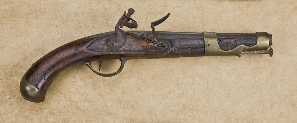 Revolutionary war period French flintlock pistol model of 1763/66, dated 1774. As found untouched original condition. This regulation .69 caliber pistol shows 9” barrel and metal surfaces show a light to slightly heavy scattered rust and pitting with absolutely no cleaning and in its original flintlock configuration. The stock is in good to very good condition with some small marks, mars, a few worm holes, slight hairline cracks, normal aging. Carved behind sideplate with initial “B” and military type “C” [Star] “81” and a good clear cartouche behind the sideplate. There is a inventory or museum type number that has been electric pencil engraved on the trigger guard and is light. A period iron ramrod is included. Many of these were imported and used in the revolution. Refer: G. C. Neumann’s Battle Weapons, page 253. With appraisal letter from noted Eastern dealer Paul M. Ambrose describing the pistol and evaluating it at $3,775. Est: $1,250 - $2,500