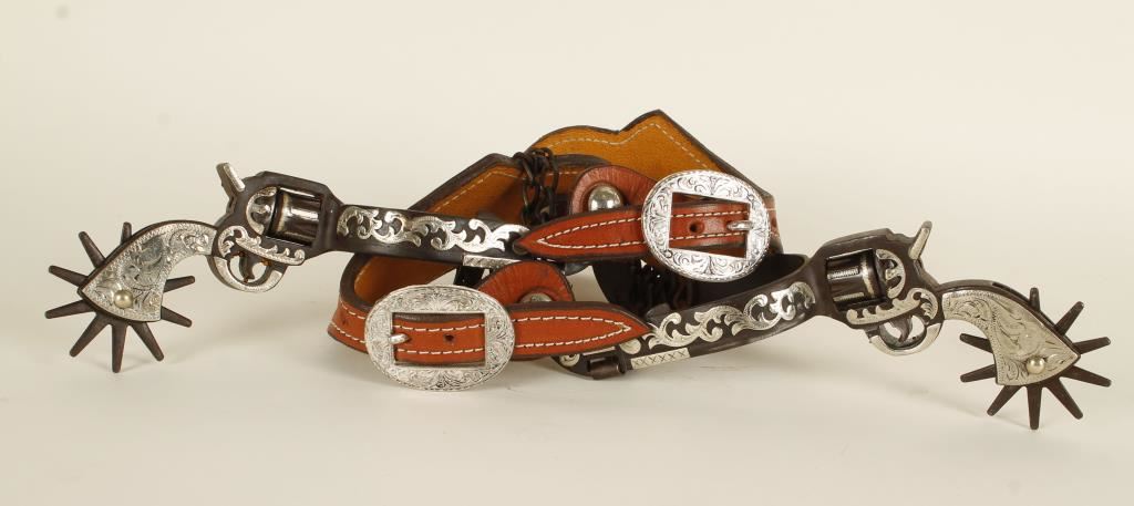 Brown leather spur straps with basket weave design with nickel engraved buckles and raised silver accents on the revolver. Unmarked.