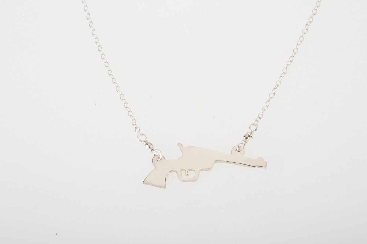 This unique hand-cut, elegant revolver will make your day! The charm is approximately 9/16 x 1 3/16, falling just below the collar bone on a 16-inch chain. It is made of sterling silver.