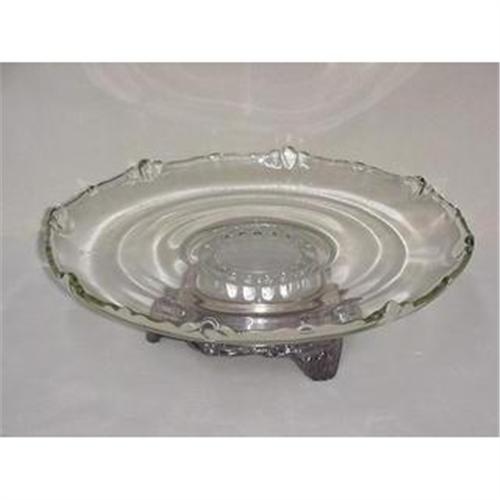 A depression glass cake plate, 13'' in diameter, sits atop a silverplated stand and revolves. Minor surface scartches on glass from use.
