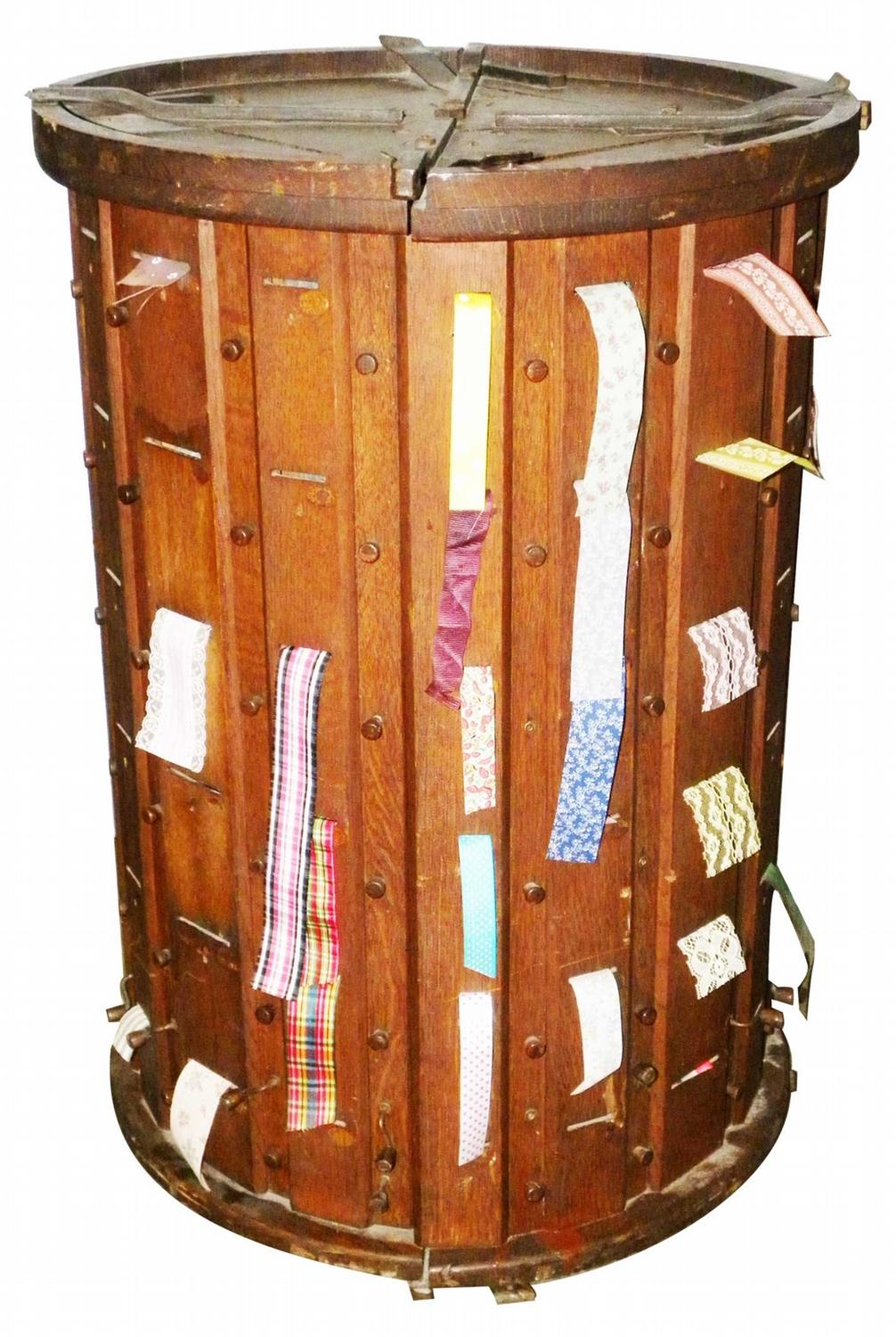 Revolving Oak Ribbon Display Cabinet, filled with ribbon. Very good original condition. 24 inch diameter X 34 3/4 inches tall.