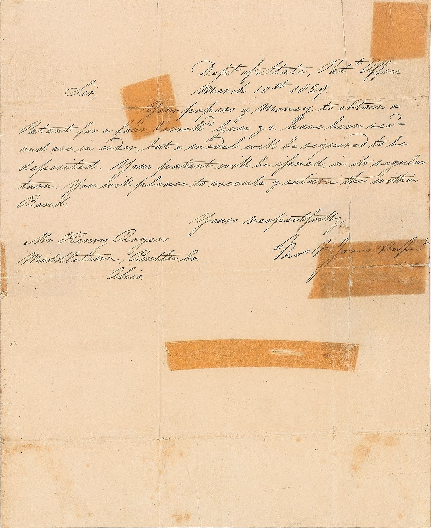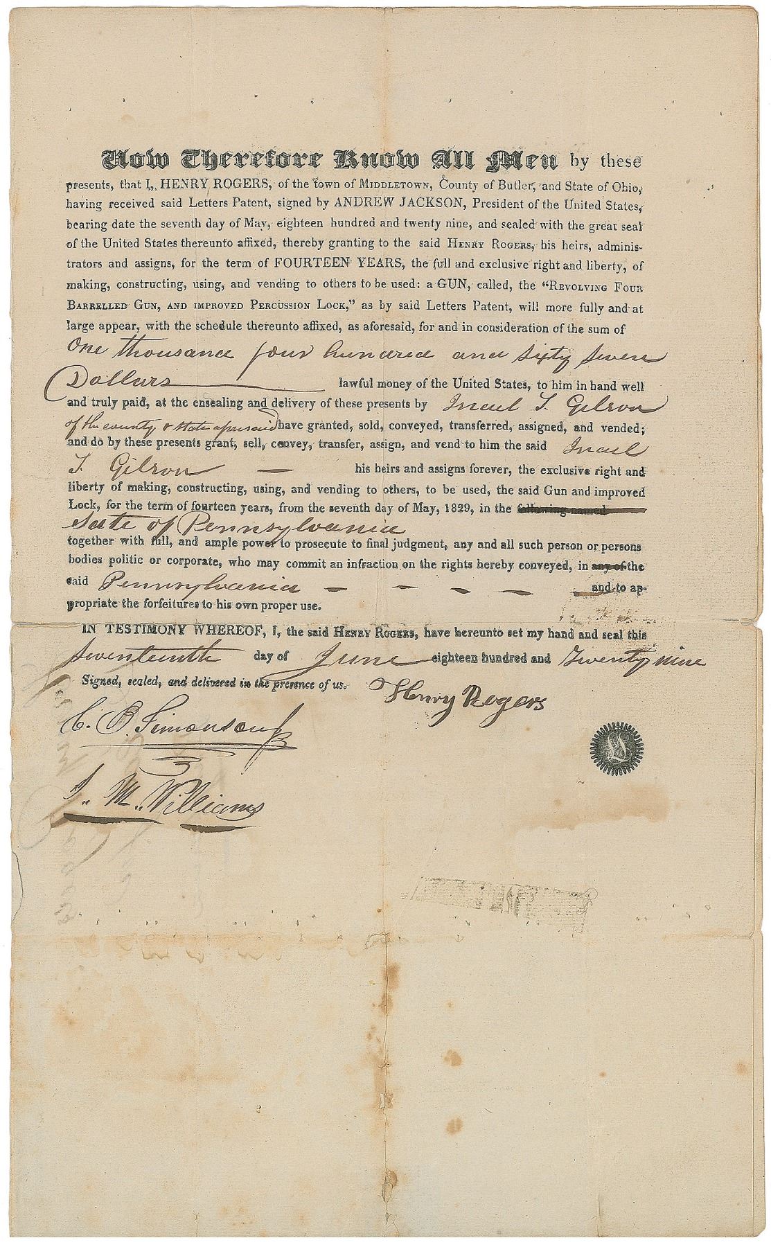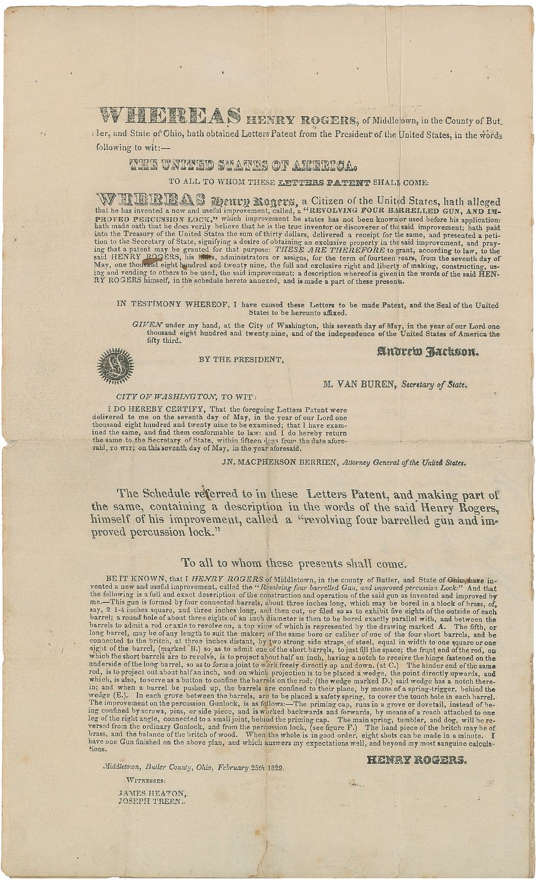 Partly-printed DS, signed “Henry Rogers,” one page, 7.75 x 13, June 17, 1829. Letters patent issued to Ohio gunsmith Henry Rogers for a revolving four-barreled gun and improved percussion lock, issued six years before Samuel Colt's patent for his more famous six-barreled revolver. In part: "This gun is formed by four barrels, about three inches long, which may be bored in a block of brass, of, say 2 1-4 inches square, and three inches long, and then cut, or filed so as to exhibit five eights of the outside of each barrel; a round hole of about three eights of an inch diameter is then to be bored exactly parallel with, and between the barrels to admit a rod or axle to revolve on…The fifth, or long barrel, may be of any length to suit the maker; of the same bore or caliber of one of the four short barrels, and be connected to the britch, at three inches distant, by two strong side straps of steel, equal in width to one square or eight of the barrel…so as to admit one of the short barrels, to just fill the space; the front end of the rod, on which the short barrels are to revolve, is to project about half an inch, having a notch to receive the hinge fastened on the underside of the long barrel, so as to form a joint to work freely directly up and down…When the whole is in good order, eight shots can be made in a minute." Signed at the conclusion by Rogers and countersigned by two witnesses. Additionally includes a letter from Patent Office Superintendent Thomas P. Jones, stating that Rogers's application for patent and patent fees had been received. In very good condition, with intersecting folds, creasing, light staining, some tape reinforcements to the reverse, and small binding holes along the top.