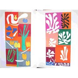 40 compositions en couleurs sur simple, double, triple ou quadruple page. "Les oeuvres reproduites en lithographie en couleurs ont été réalisées par l'artiste, aux papiers gouachés, découpés aux ciseaux et collés. Elles sont accompagnées de dessins exécutés pendant la même période ou antérieurement. Matisse a composé spécialement la couverture de ce volume. Sous sa direction ont été tirées, au cours de l'année 1954, les premières de ces planches lithographiques" (cfr p. 2). Avant-dernier numéro de cette revue mythique.