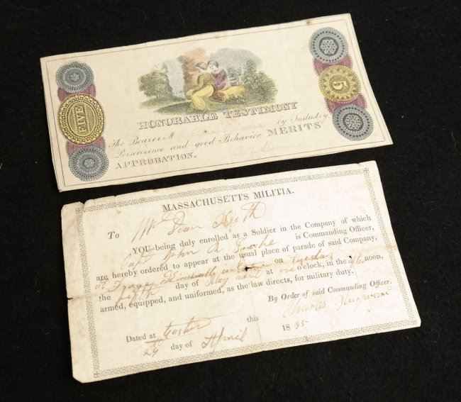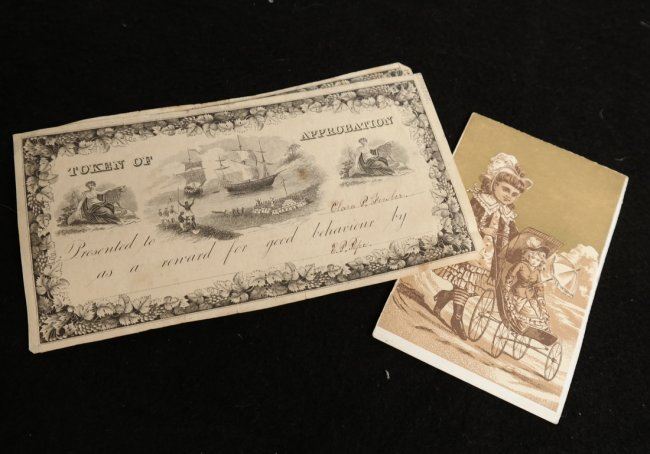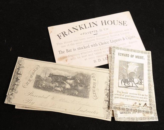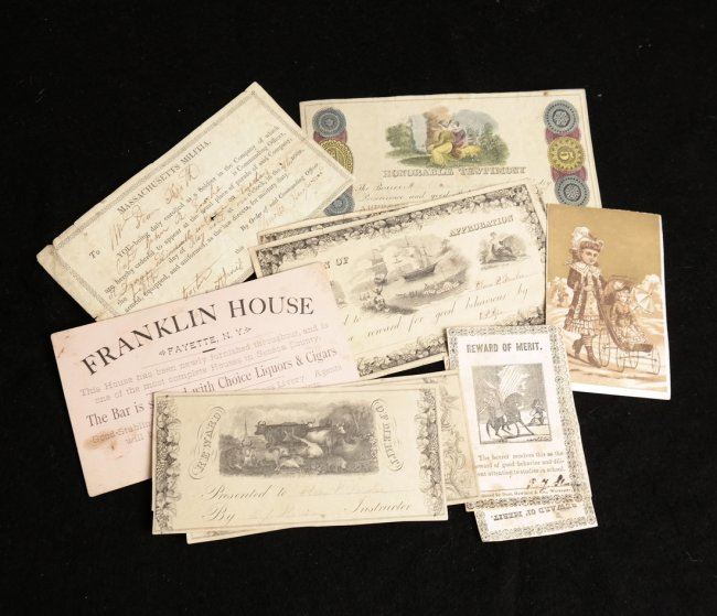 Eight rewards, all different including one that has been hand-colored. Plus three other pieces of paper ephemera. Total 11 items, average fine condition