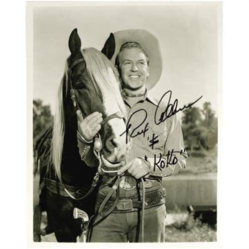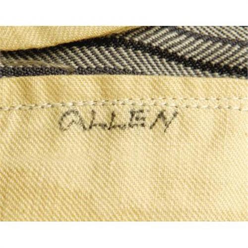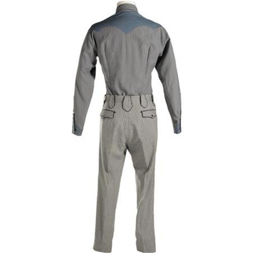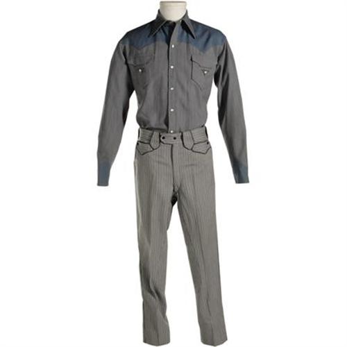 <B>Rex Allen Stage Worn Western Suit.</B></I> A very nice Western-style shirt with striped trousers, worn by the famous singing cowboy. The costume is an early design by Nudie. Included with it is a b&w 8" x 10" photo inscribed and signed by Allen in black marker. The clothes are in Very Fine condition with a few very small holes on the shirt, and the photo is in Excellent condition. <I>From the Robert Johnson Memorabilia Collection.</B></I><BR><BR><b>Shipping:</b> Clothing, Costumes & Jerseys (<a target="_blank" href="http://www.heritageauctions.com/common/shipping.php">view shipping information</a>)