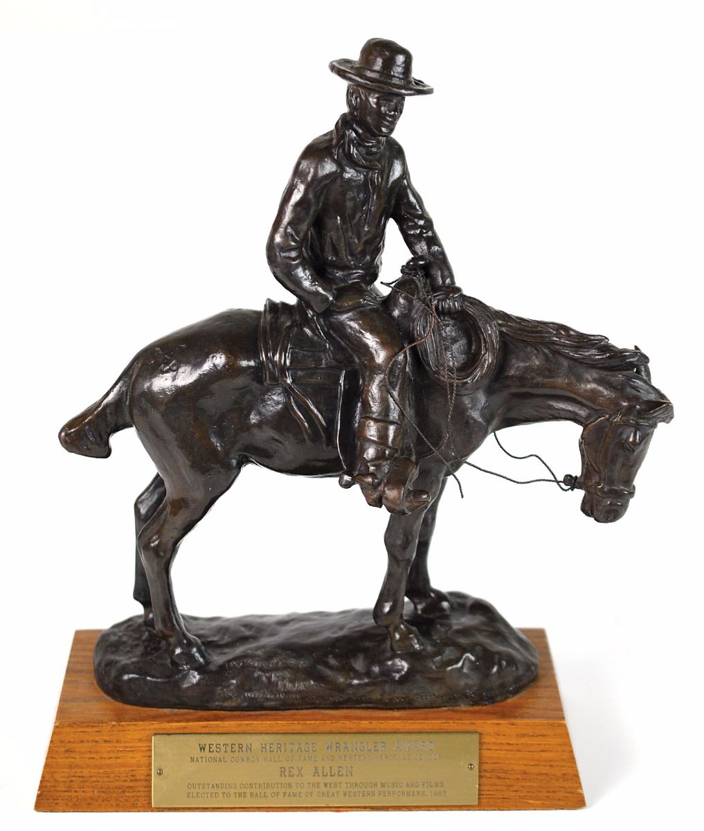 An exceptional Western Heritage Wrangler Award, the bronze statuette measuring 11.5? tall and set upon a wooden 9.25 x 1.75 x 4.25 base, featuring an engraved metal plaque reading: “Western Heritage Wrangler Award, National Cowboy Hall of Fame and Western Heritage Center, Rex Allen, Outstanding contribution to the West through music and films, elected to the Hall of Fame of Great Western Performers, 1983.” The ‘Wrangler’ statue, cast in bronze, portrays a remarkably detailed cowboy on horseback; this substantial example of the award weighs nearly twelve pounds, significantly larger than the ‘normal’ award more frequently seen. In fine condition. Since its inception in 1961, fewer than one hundred people have been inducted into the Hall of Fame—including the likes of Gary Cooper, John Wayne, and Roy Rogers. Allen was a film actor, singer, and songwriter known as the ‘Arizona Cowboy,’ whose contributions included the narration of many Disney nature and Western film productions, starring roles in several B-Westerns during the 1950s, and a number of hit country songs. A positively exquisite award embodying the spirit of Allen’s career in Western entertainment.