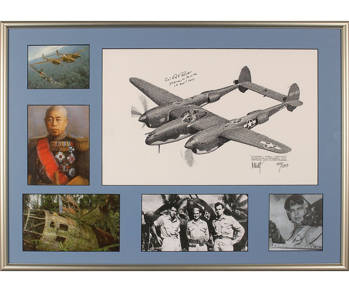 Shot down the bomber carrying Admiral Yamamoto, the man who planned the attack on Pearl Harbor. Yamamoto’s death deprived Japan of its greatest military tactician, thus turning the tide of the war. Limited edition 17 x 11 print of a Lockheed P-38 Lightning, numbered #589/1000, signed in black felt tip, “Col. Rex T. Barber, Yamamoto mission, 18 April 1943.” Also signed in black felt tip by the artist, Joe Milich. Matted and framed with five photos to an overall size of 26.5 x 19.25. In very fine condition. Oversized.
