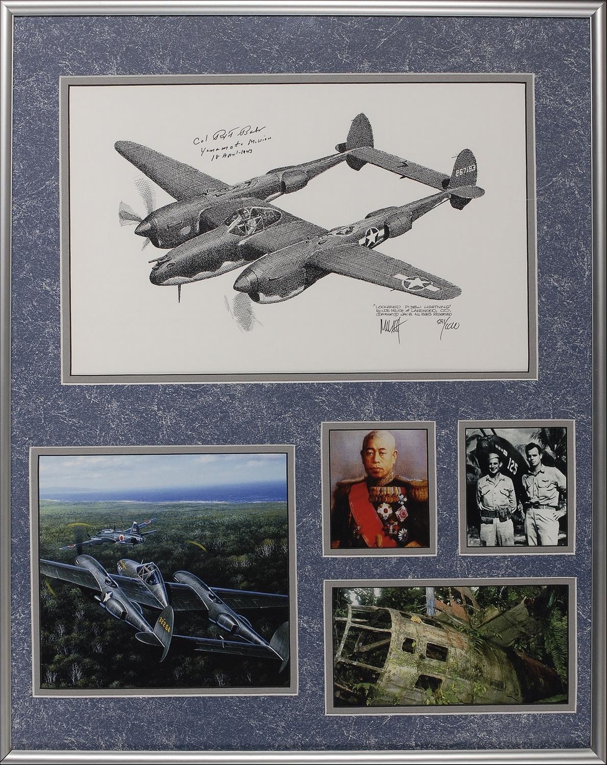 Shot down the bomber carrying Admiral Yamamoto, the man who planned the attack on Pearl Harbor. Yamamoto’s death deprived Japan of its greatest military tactician, thus turning the tide of the war. Limited edition 17 x 11 print entitled a Lockheed P-38U Lightning, numbered #591/1000, signed in black felt tip, “Col. Rex T. Barber, Yamamoto Mission, 18 April 1943.” Also signed in black felt tip by the artist, Joe Milich. Double matted and framed with four photos to an overall size of 22 x 27.5. In fine condition. Oversized.