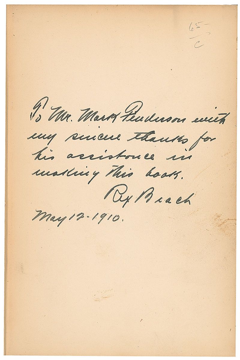 Signed book: Going Some. First edition. NY: Harper and Brothers, 1910. Hardcover, 5 x 7.5, 294 pages. Signed and inscribed on the first free end page, “To Mr. Mark Fenderson with my sincere thanks for his assistance in making this book. Rex Beach, May 17, 1910.” In very good condition, with light toning and pencil notations to signed page, toning and notations to pastedowns, pencil notation to last page, hinges a bit weak, and light wear to covers and spine.