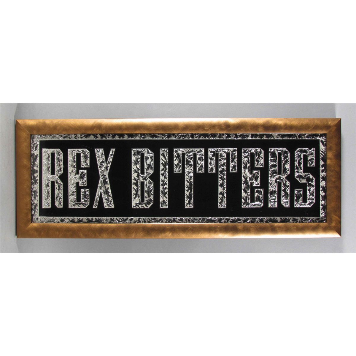 Rex Bitters Reverse Glass Sign. Glue chipped letters. Attributed to Western Sandblasting Co. Chicago. Excellent condition. 20 1/2 X 7 1/2 inches in metal frame. Start Price $50