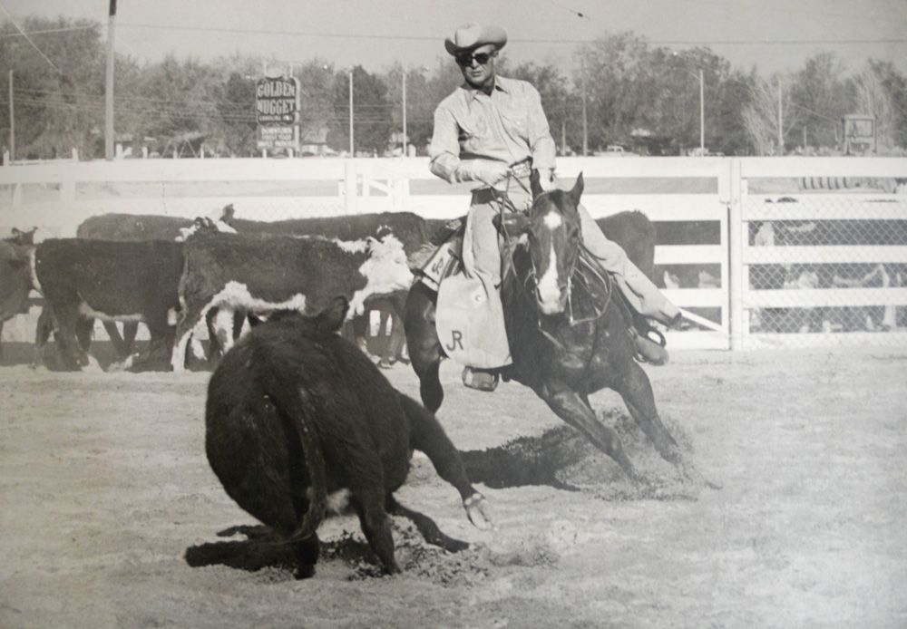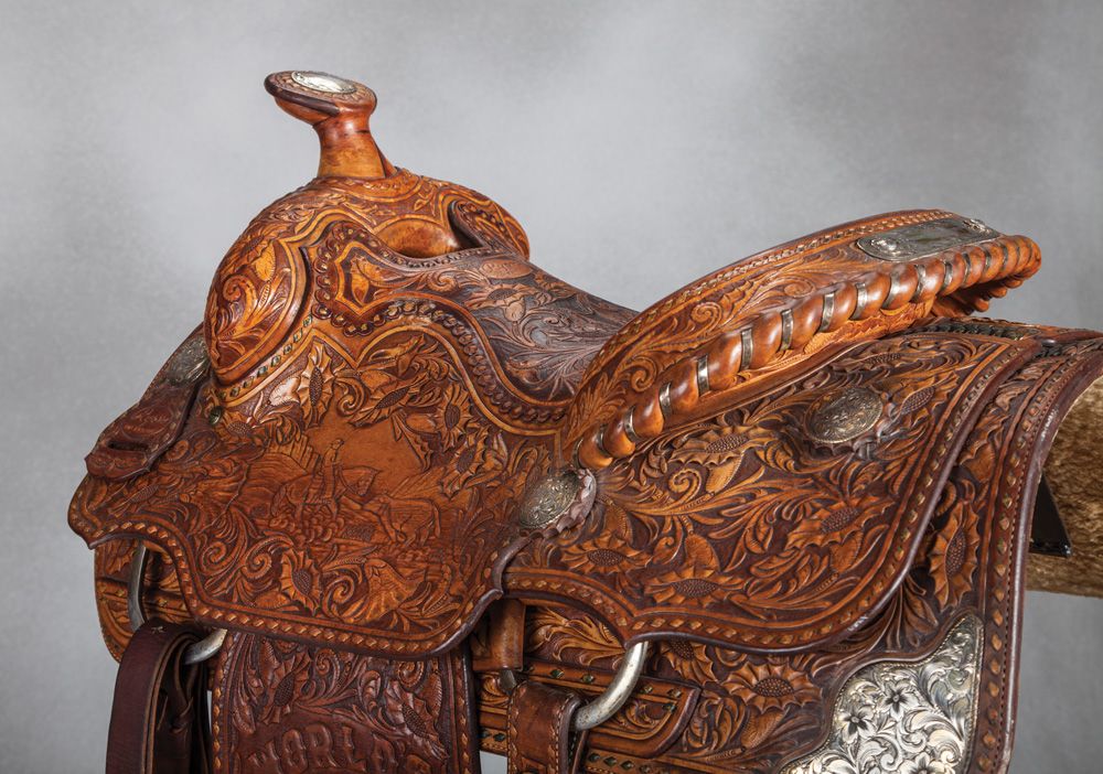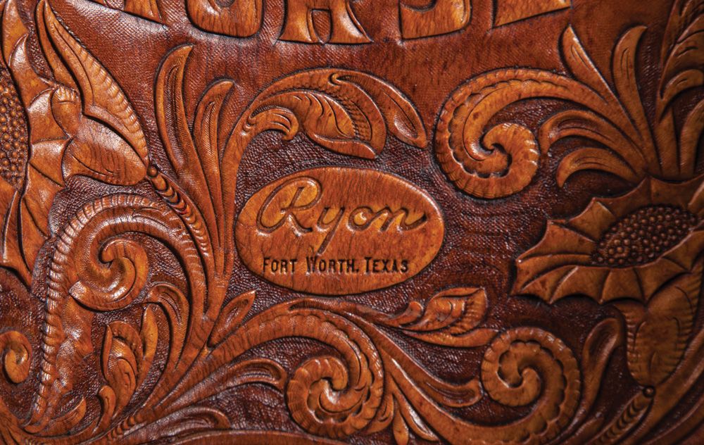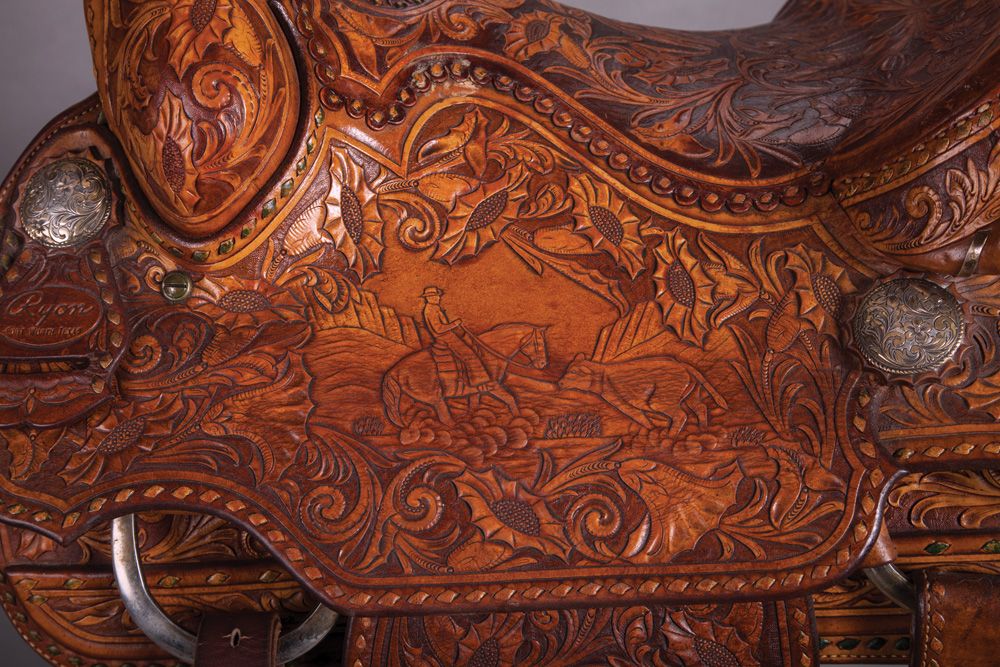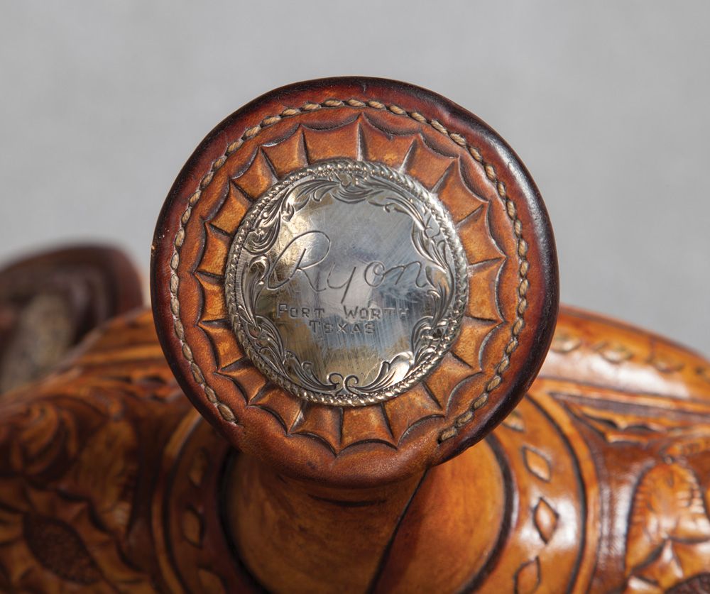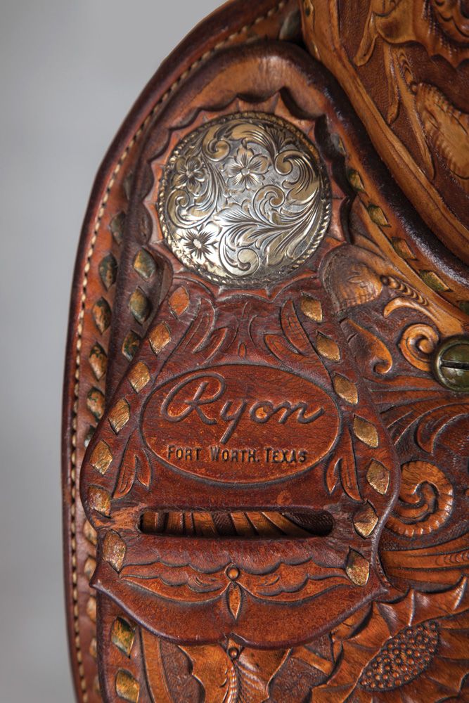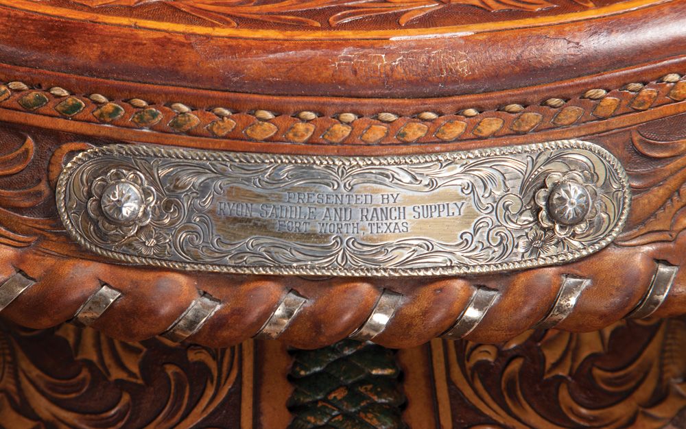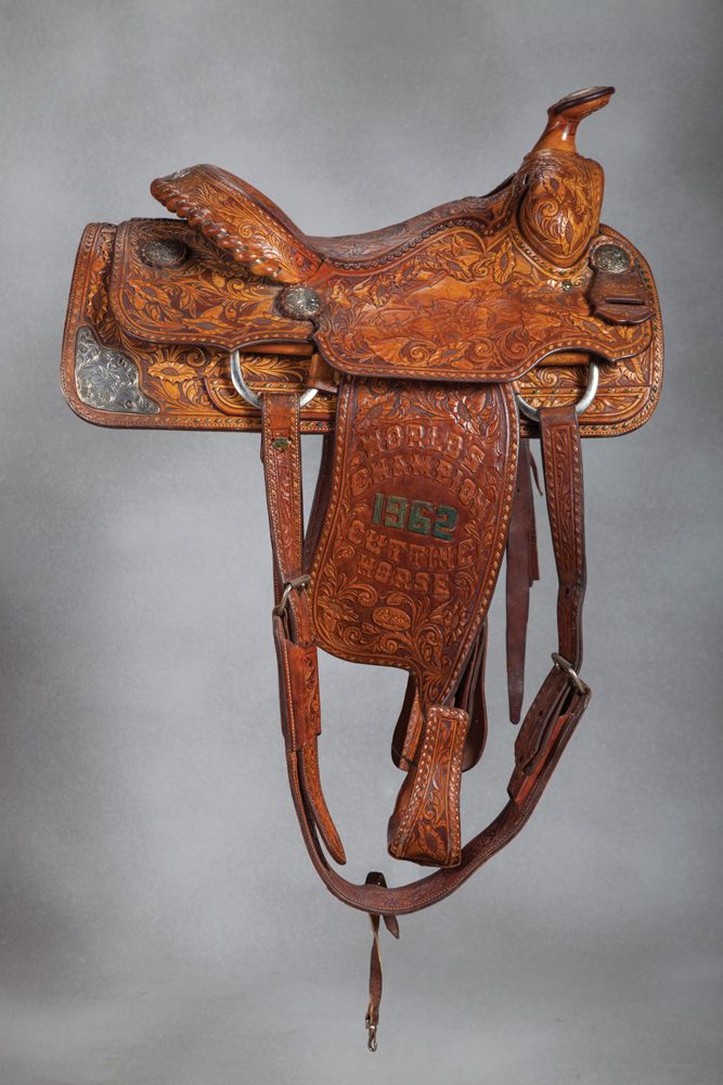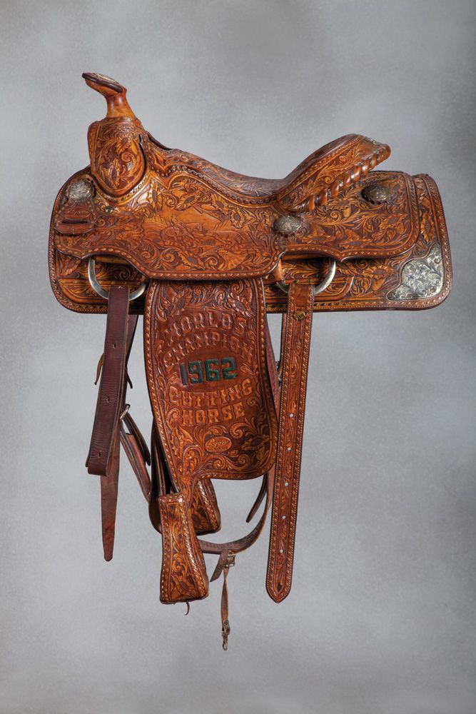 Rex's World's Championship Cutting Horse saddle won in 1962, by Lyon. Two-tone leather with pictorial carving on the jockeys, silver mountings and floral carving. The fenders are tooled "World's Champion Cutting Horse 1962" Even the seat is tooled on this piece of art. Cheyenne roll cantle with silver strap wrap. Buckstiched edges overall. A very fine saddle with important history to the horse world. The cantle plate reads "Presented by Ryon Saddle and Ranch Supply - Fort Worth, Texas"