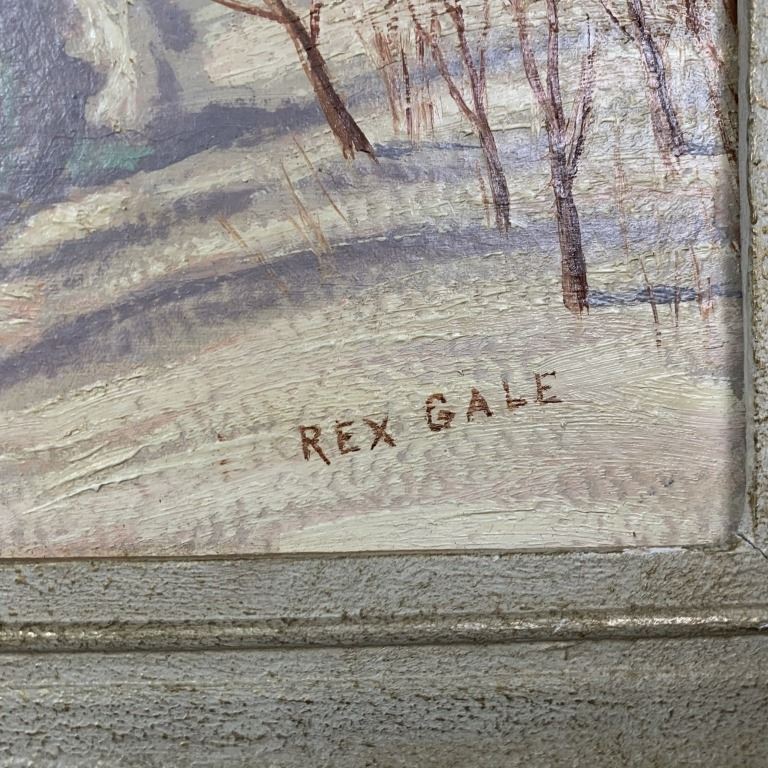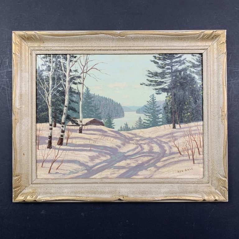 A Rex Gale original oil on board painting, signed lower right. This piece is of a winter landscape, snowy path with clear tire tracks, heading towards a cabin, with a large body of water and trees in the background. This painintg is in excellent condition, and will require the an extremely light cleaning.