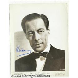 <B>Rex Harrison, Paul Henreid, Joel McCrea, and Ray Milland Autographs.</B></I> Harrison's autograph is on a signed original 8" x 10" sepia still from the 1945 film "Blithe Spirit." Henreid's signature is on a one-page television contract dated 2/21/75, for a role in the TV movie "Mrs. R - Any Number Can Kill" which was released with the title "Death Among Friends." Henreid is best remembered as freedom fighter Viktor Laszlo in "Casablanca." McCrea's autograph is on an 8" x 10" original still from the film "The Unseen." Milland's autograph is on an 8" x 10" black and white publicity still from the 1954 film "Dial M for Murder," on which Grace Kelly is also pictured. <I>Accompanied by COA from PSA/DNA. </B></I> <BR><BR><B>Important notice:</B> Heritage usually auctions material at the rate of 200-250 lots per hour. On some occasions eBay Live bid software or the Internet may not be able to keep up with the pace of the auction. We recommend placing a realistic absentee bid now as insurance to avoid disappointment. Occasionally the auctioneer may eliminate or reject an eBay Live bid, and the auctioneer may also reopen a lot after the close of the eBay live bidding (usually because we missed an audience bid), and may reject your bid even if it shows you as the winning bidder. By bidding via eBay Live, you agree that Heritage may award the lot to another bidder at its sole discretion under the circumstances described above or any other reasonable circumstances. Since eBay bids are not shown to us until we open the lot on the floor, we treat those bids just like floor bids. In most cases the floor responds before the eBay bid is presented to us, due to Internet lag time, so for consistency we have made it a policy that floor bids are always considered first over tie eBay live bids. Also please note that all Heritage lots purchased through eBay Live carry a 24.5% Buyer's Premium. Please make sure you read the Terms and Conditions before you bid.