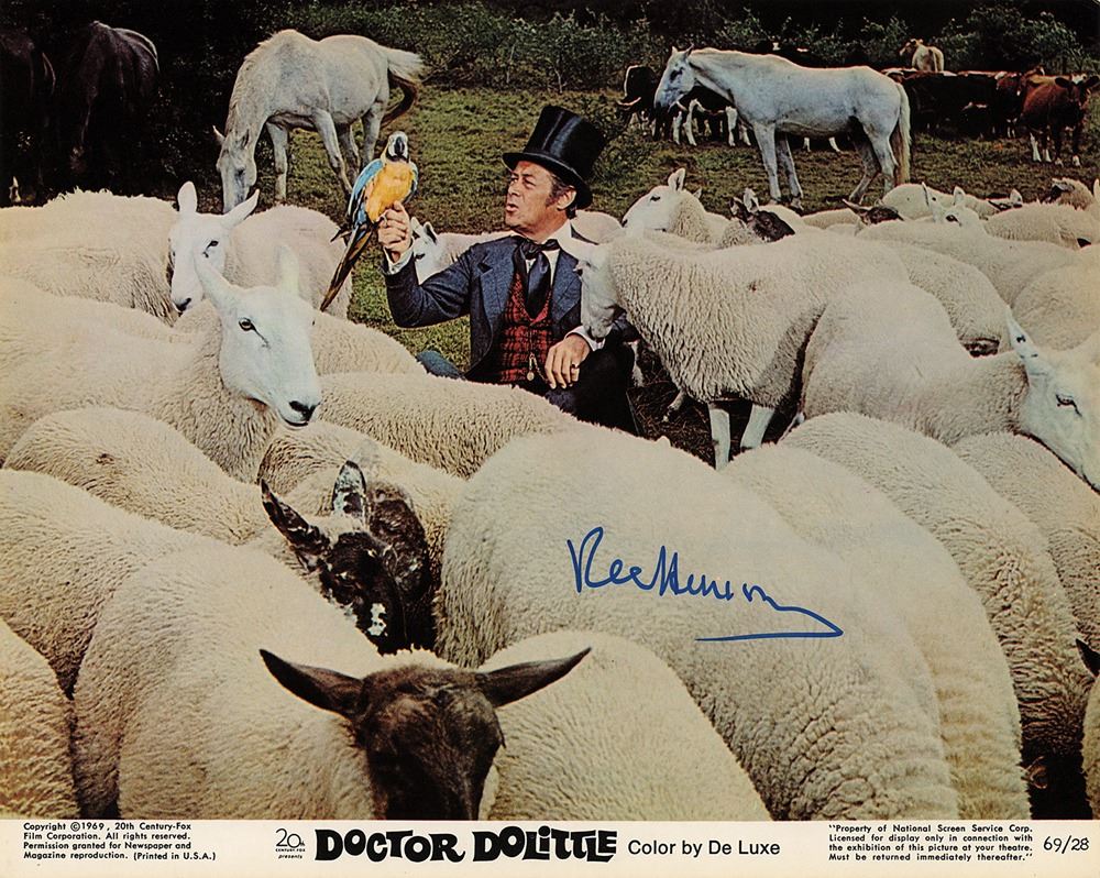 Color 10 x 8 mini lobby card for the musical comedy film Doctor Dolittle, signed in blue felt tip by Rex Harrison. In very fine condition. Originally obtained by in-person specialist Mike Wehrmann.