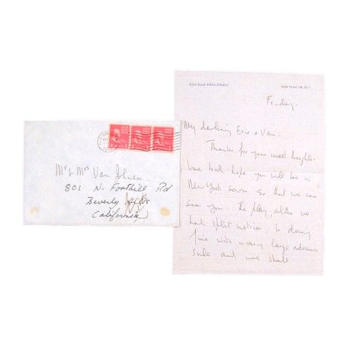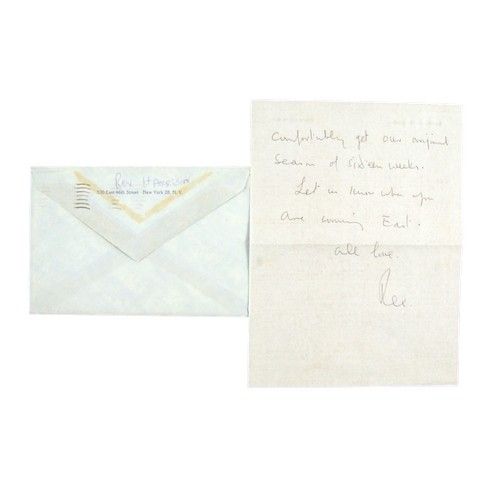 Rex Harrison Signed Personal Letter - Some great stars have a long and distinguished career, but find themselves in one role that literally defines them for life. A most magnificent example of this is Rex Harrison, who of course will always be known for creating one of the greatest characters on stage and the screen as Professor Henry Higgins in “My Fair Lady”. His career spanned over 50 years with over 100 motion pictures and stage productions, including, besides the beloved Professor, “Doctor Dolittle”, “Cleopatra”, “The Ghost and Mrs. Muir”, and “The Agony and the Ecstasy”. An extremely private man, who spent his “off screen/stage” time far away from the spotlight, autographs, let alone personal handwritten letters from this legend, are extremely rare. This is a personally written letter from Rex Harrison to his long time friends, actor Van Johnson and his wife Evie, thanking them for their note to him wishing him good luck on his new Broadway play “Venus Observed” in 1952. The play was being directed by Laurence Olivier, and was written by award-winning playwright Christopher Fry. It is handwritten by Mr. Harrison on his personal stationary, and is signed “Rex”. It also includes his original personal stationary envelope, which he has addressed himself, as well as written his name over his printed address on the back. The envelope has the original New York Postmark (dated February 25, 1952), along with three two-cent cancelled stamps. This wonderful piece of historic memorabilia comes from Van Johnson’s personal collection and includes a Letter of Provenience from his daughter Schuyler Johnson along with a copy of her famous controversial cover story article “My Life As A Hollywood Princess”, about her trials and tribulations growing up in Beverly Hills with a superstar father and extended “family” with some of the most famous celebrities in the world.