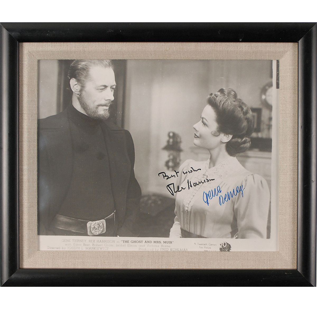 Glossy 9.5 x 7.5 20th Century Fox promotional photo for Harrison and Tierney in The Ghost and Mrs. Muir, signed in black felt tip, “Best wishes, Rex Harrison,” and blue felt tip, “Gene Tierney.” Matted and framed to an overall size of 12.5 x 10.5. In fine condition.