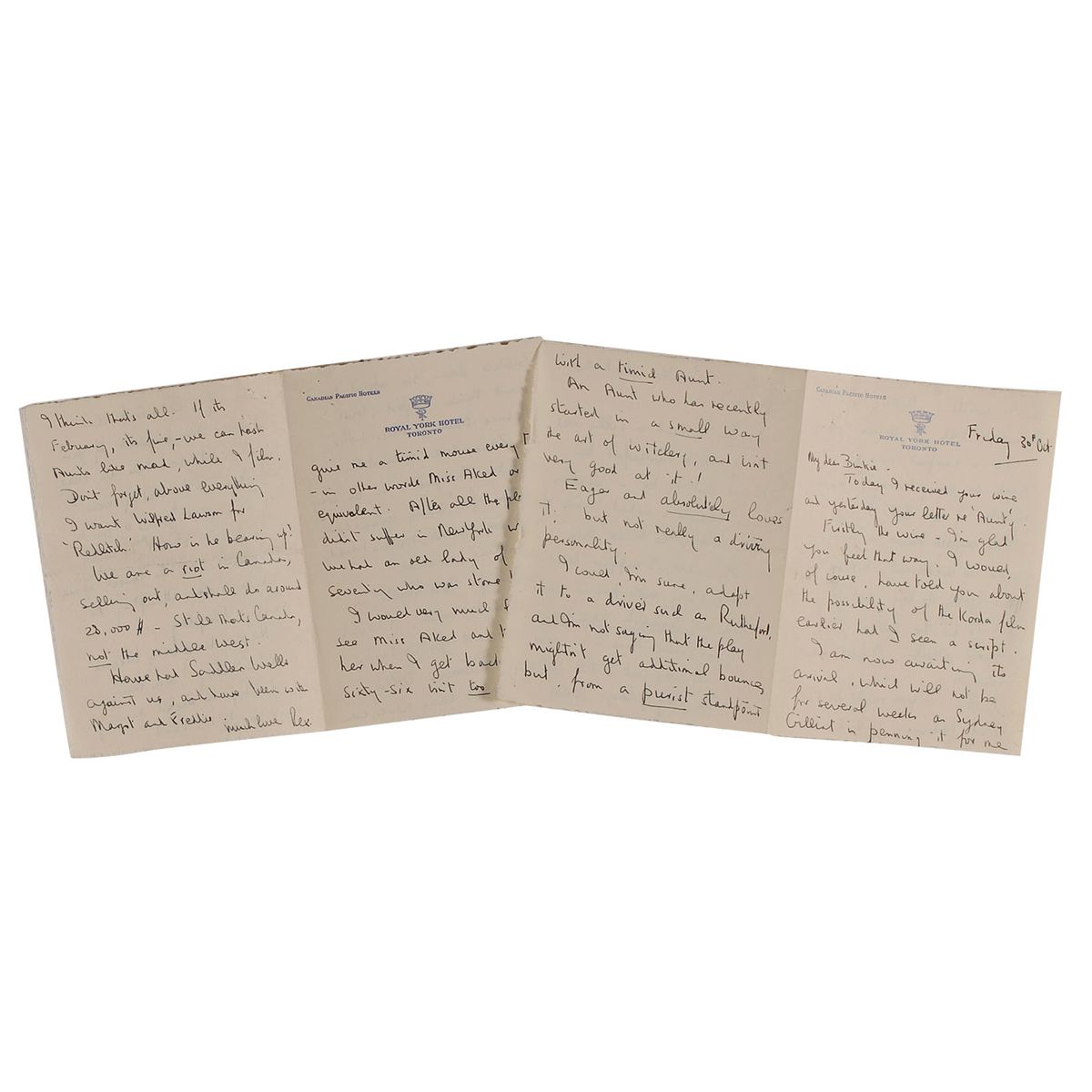 ALS signed “Rex,” eight pages on two sets of two adjoining sheets, 5.25 x 7, Royal York Hotel letterhead, October 30. Letter to his friend Binkie regarding the casting of a play. In part: “We might be home mid February, which brings me to your letter about the ‘Aunt.’ Really what a silly old bag Miss Rutherford has turned out to be 'Useless and Selfish’—What kind of play does she think this is? Oh well, I suppose we’d better hang on to her in this case—but my thoughts are these—(and surely there is no need to actually cast till the spring). The play play’s best with a timid Aunt…I could, I’m sure, adopt it to a driver such as Rutherford, and I’m not saying that the play mightn’t get additional bounces, from a purist standpoint, give me a timid mouse everytime.” In fine condition.